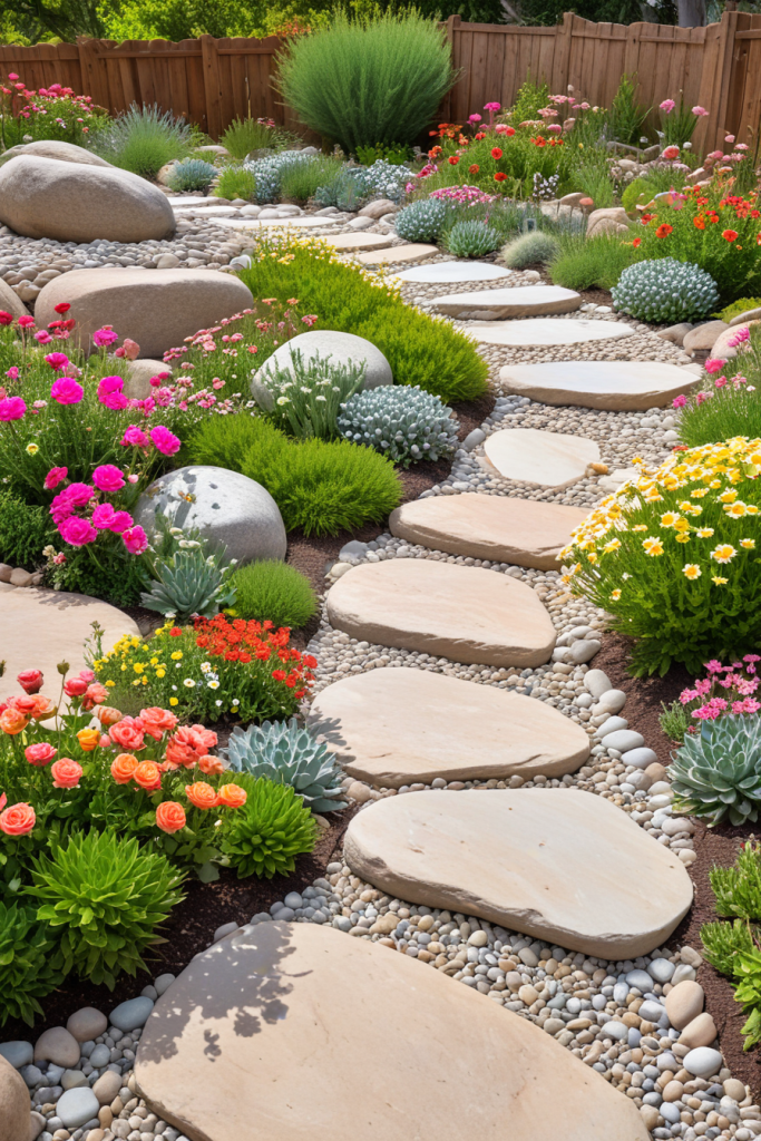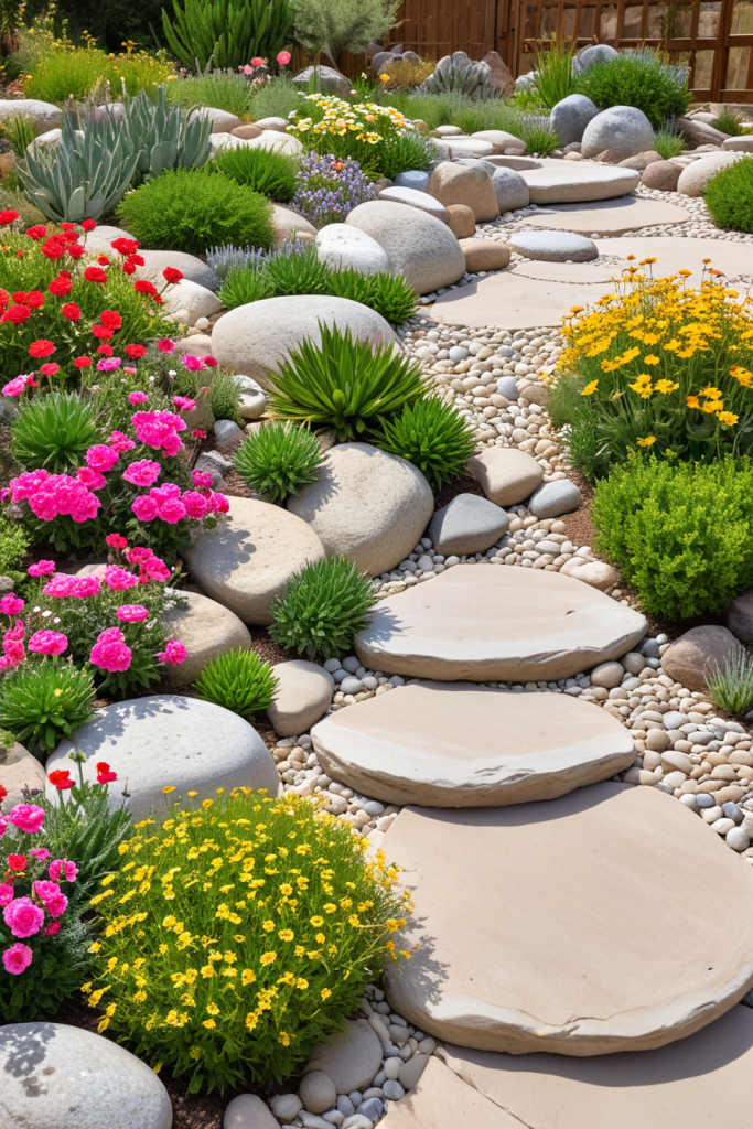 Integrating rocks into flower gardens adds texture, contrast, and depth. Large boulders surrounded by succulents and wildflowers create a desert-inspired aesthetic, while pebble pathways lined with roses and daisies add a cottage-style charm. Rock retaining walls can elevate flower beds, and Japanese rock gardens with delicate floral accents bring a Zen-like balance to the space.