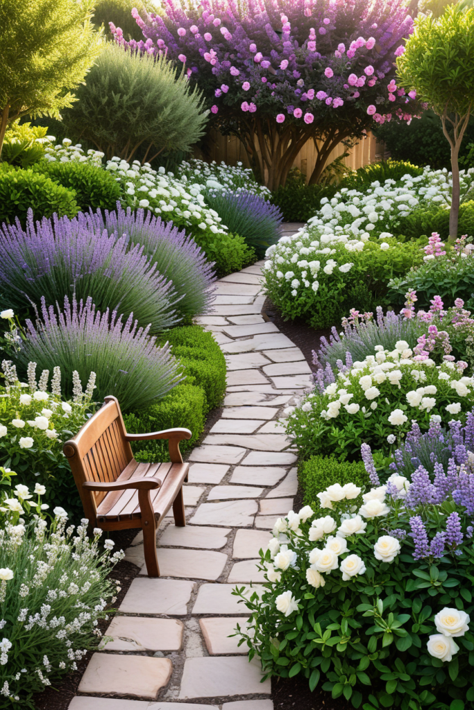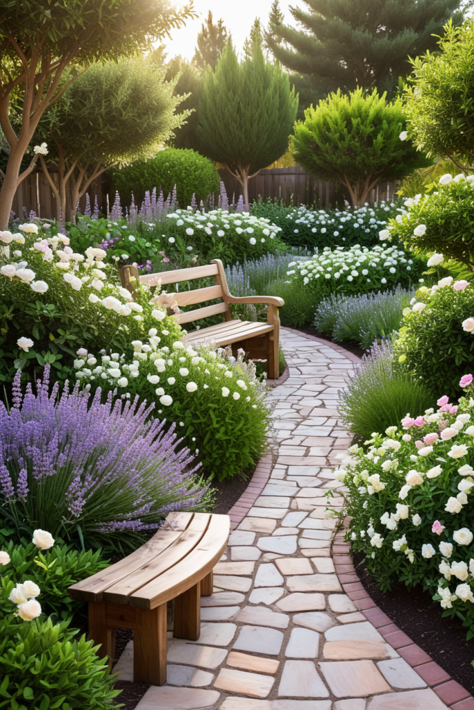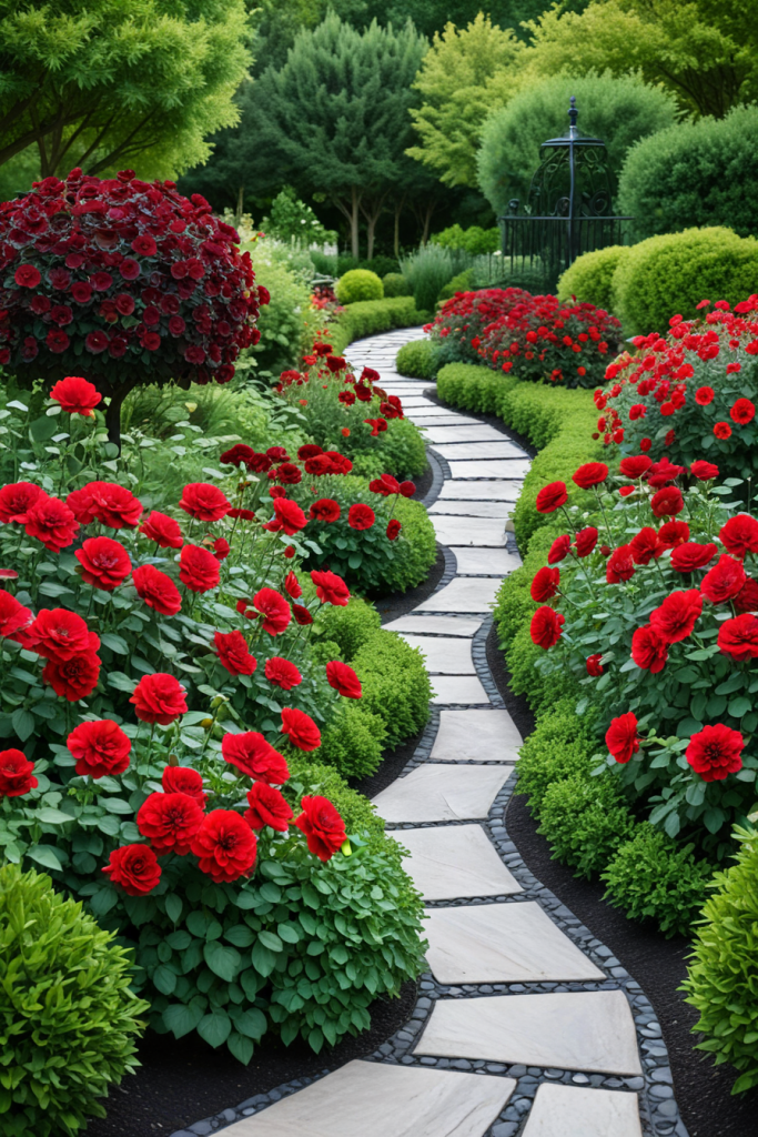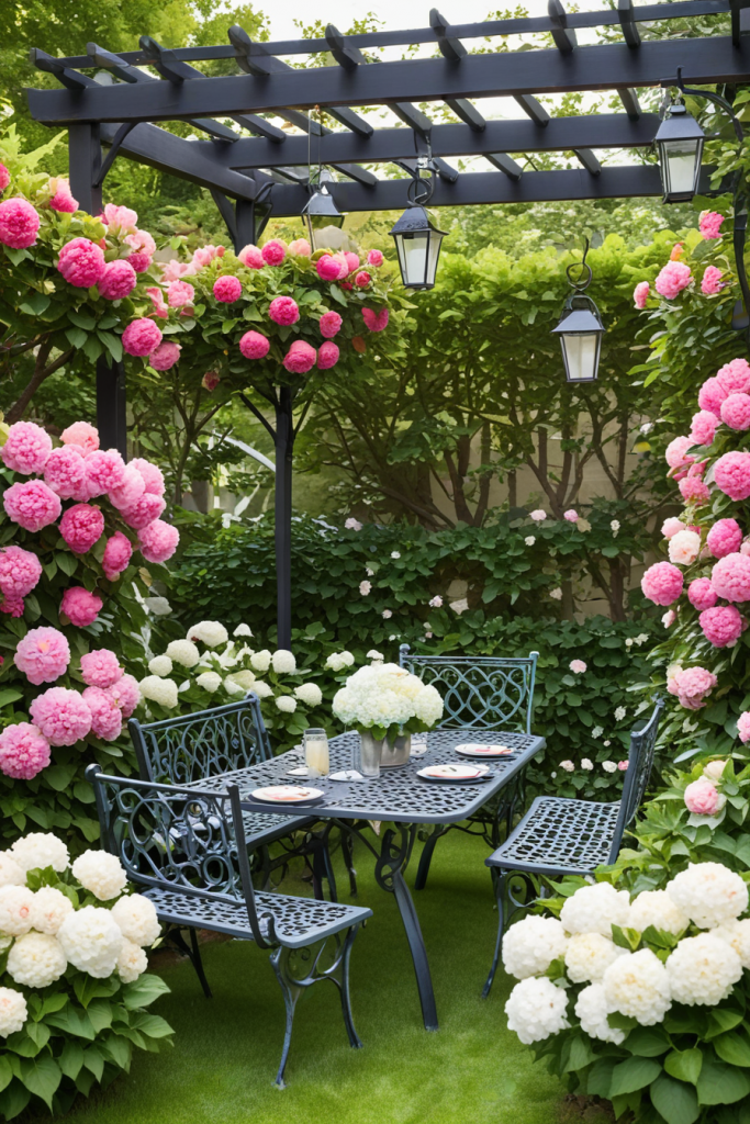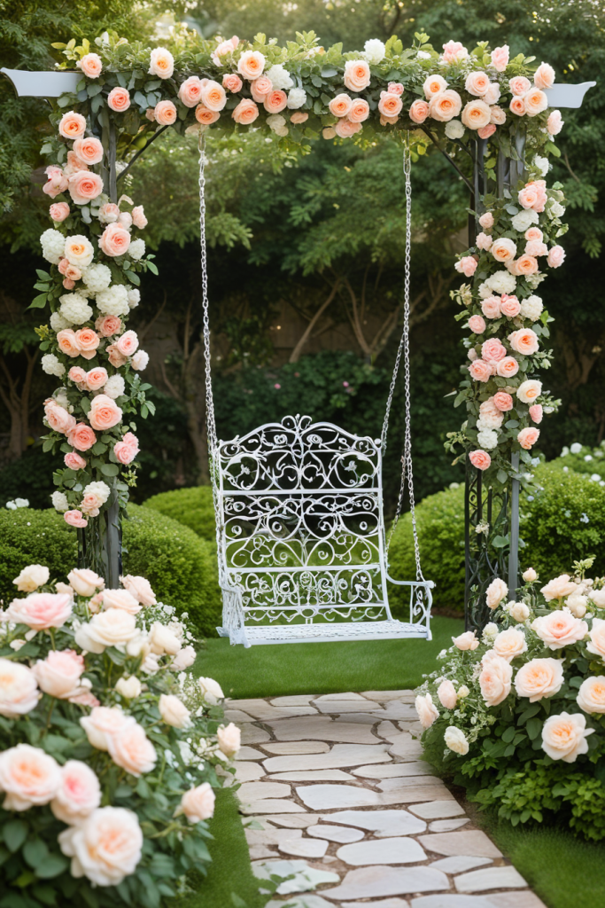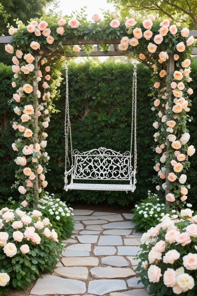 A romantic flower garden focuses on soft colors, fragrant blooms, and intimate seating areas. Choose flowers like roses, peonies, hydrangeas, and wisteria in soft pastels. Enhance the space with twinkling fairy lights, a vintage garden swing, and delicate wrought-iron furniture. A winding pathway leading to a secluded nook creates a sense of intimacy and enchantment.