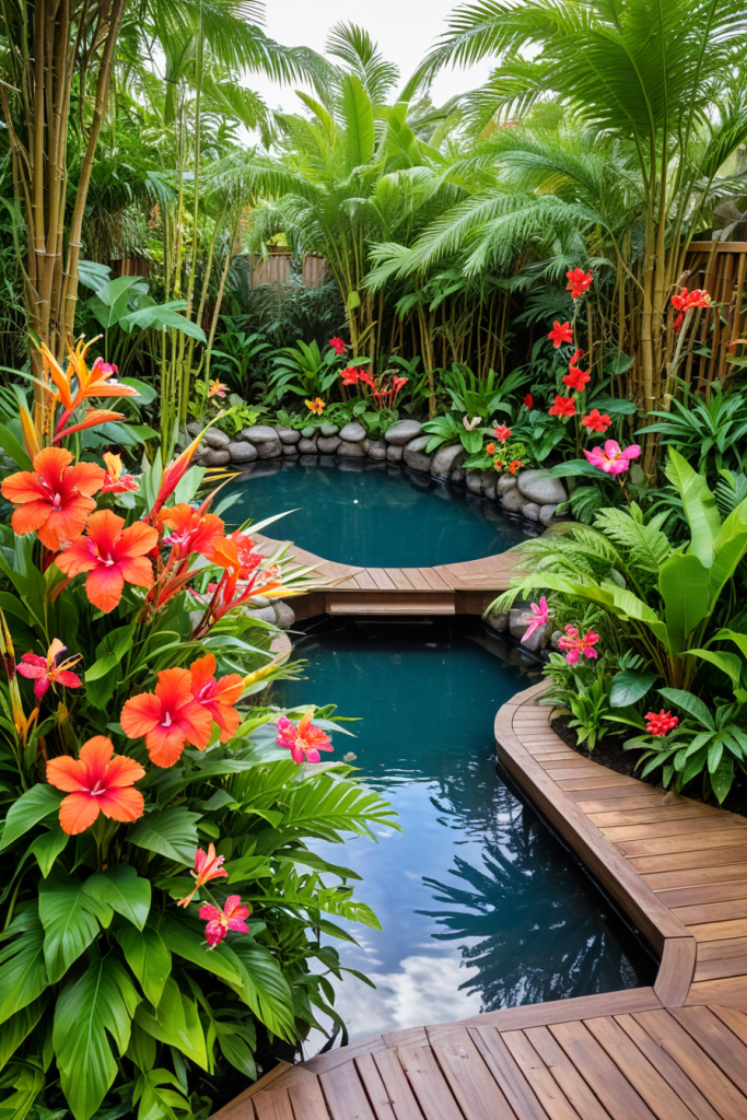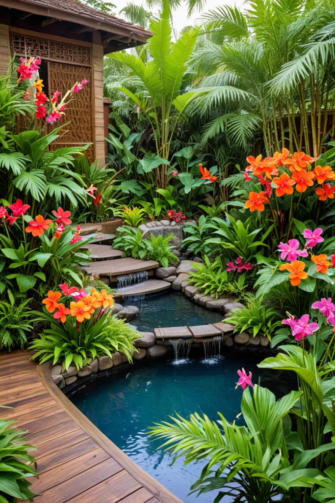 For a bold and lush aesthetic, a tropical flower garden features vibrant blooms and oversized foliage. Incorporate hibiscus, bird of paradise, orchids, and ferns alongside palm trees and banana plants. A small pond with floating water lilies, bamboo fencing, and tiki torches completes the exotic ambiance, transforming the space into a tropical escape.