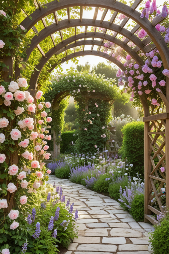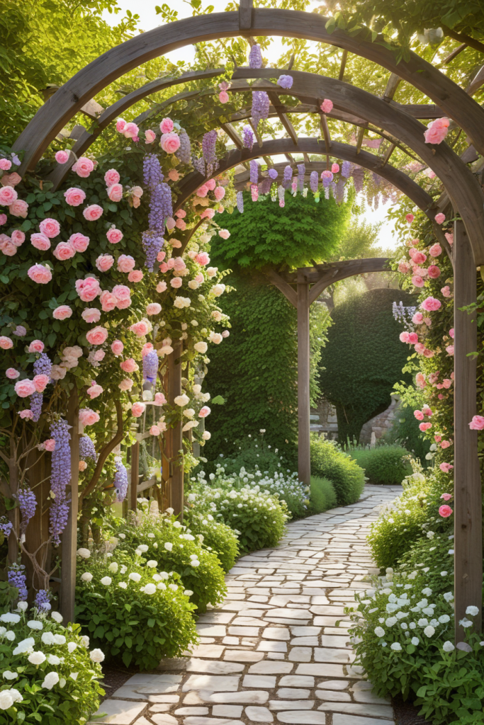 Climbing flowers add height, depth, and structure to a flower garden, making use of trellises, pergolas, and walls to maximize space. Popular climbing plants include clematis, wisteria, climbing roses, jasmine, and morning glories, each bringing lush greenery and seasonal blooms. A garden arch covered in cascading blooms creates a picturesque entryway, while a pergola draped in fragrant vines provides a shaded retreat.