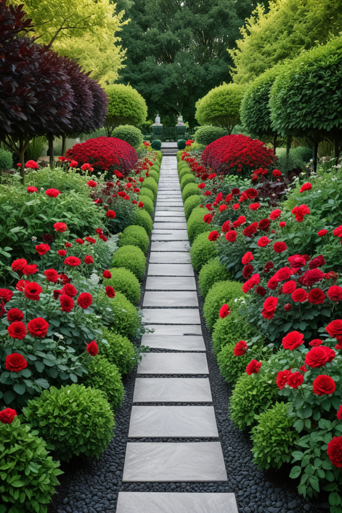 A monochrome flower garden focuses on a single color palette for a striking effect. Choose white-themed gardens with hydrangeas, lilies, and peonies for a moonlit glow, or create a dramatic red garden with roses, dahlias, and poppies. A cool-toned blue and purple garden filled with lavender, salvia, and delphiniums evokes a serene, calming atmosphere.
