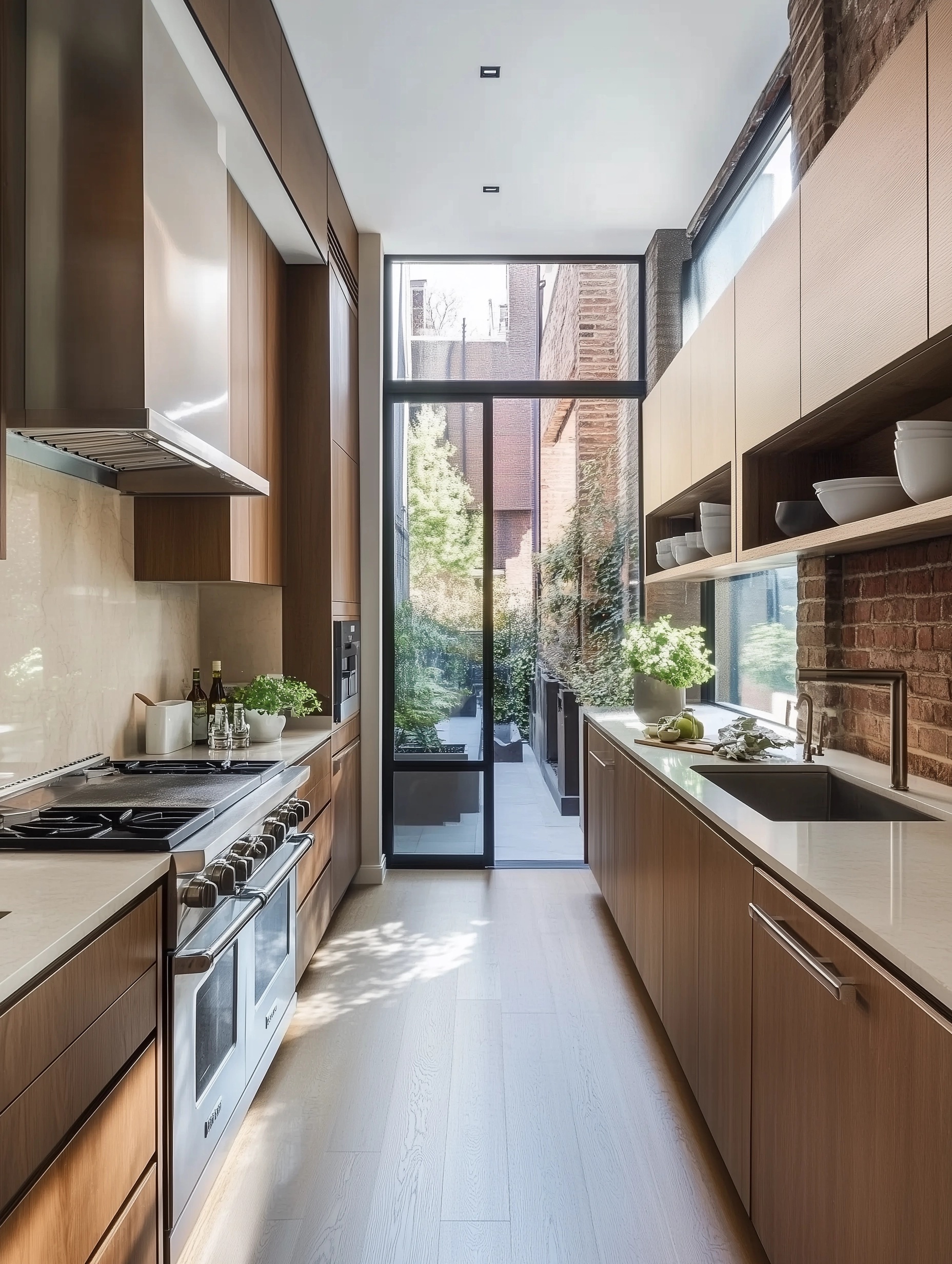 Slender galley kitchens might be difficult to handle at times, but you can make them both highly utilitarian and beautiful in a classy manner. Create an illusion of a bigger area using slimline appliances, open shelving, and light colors.