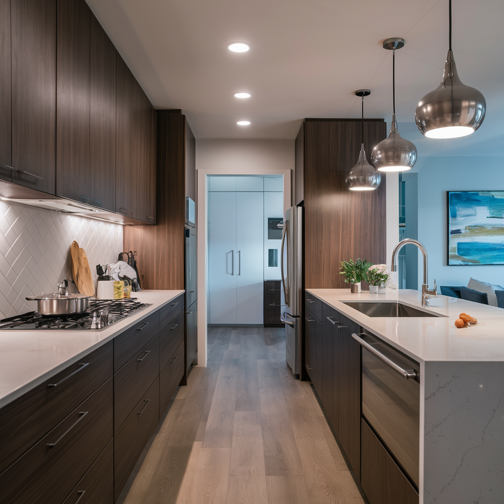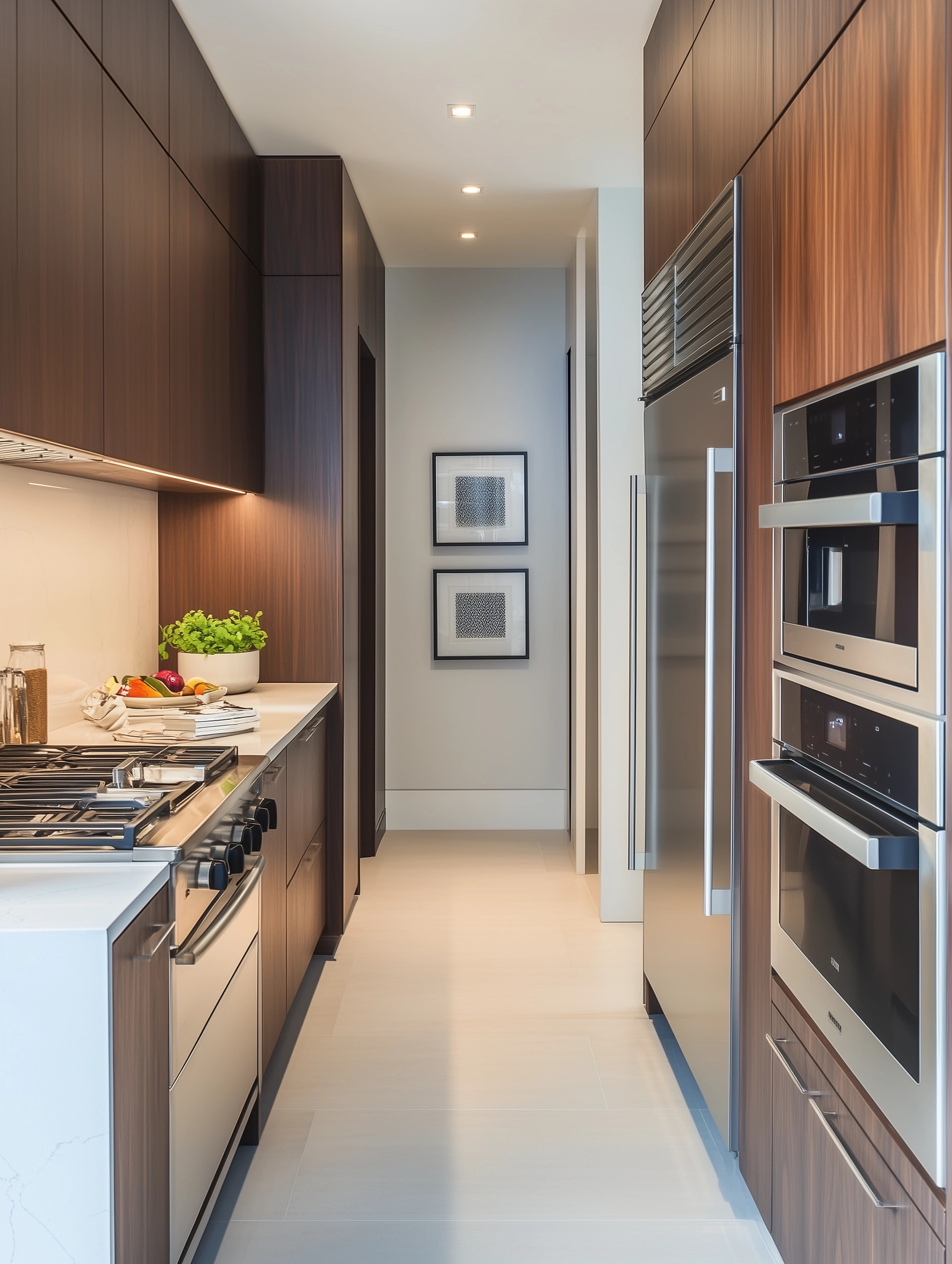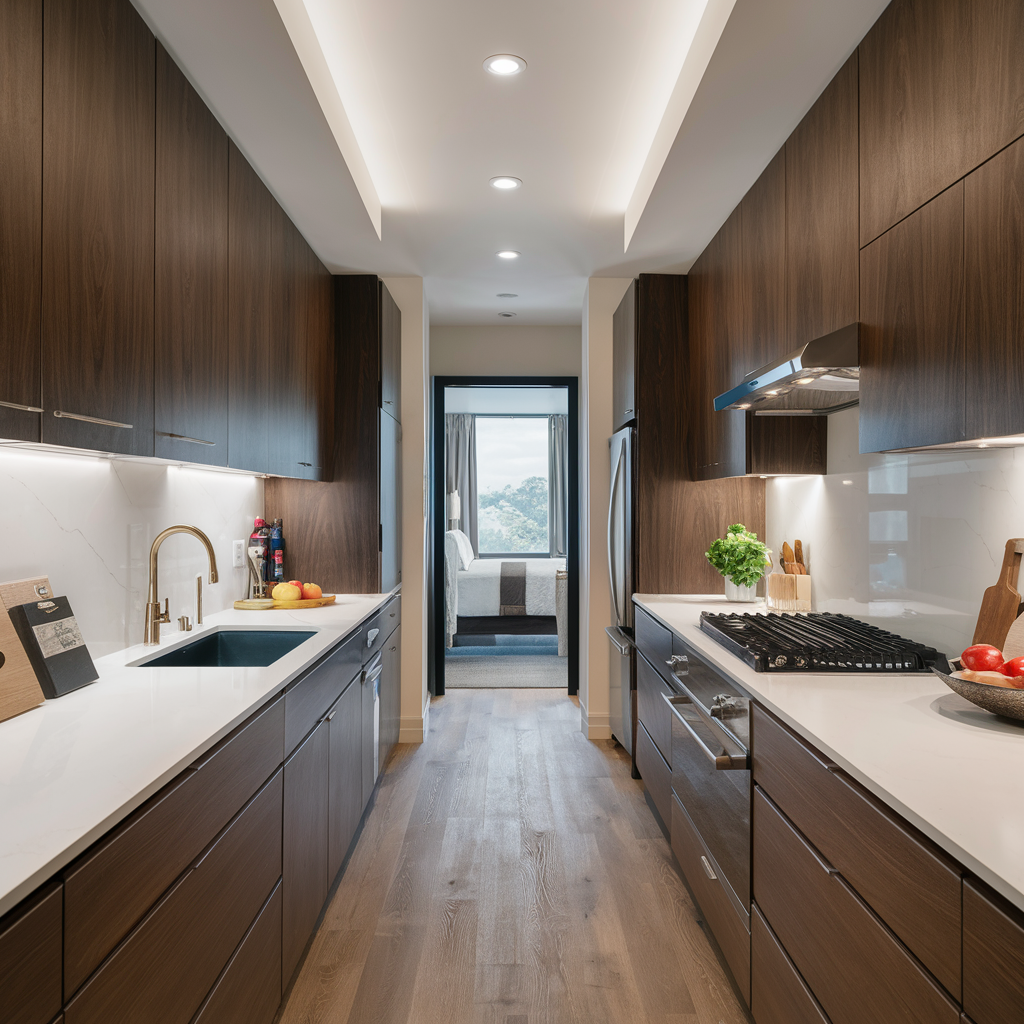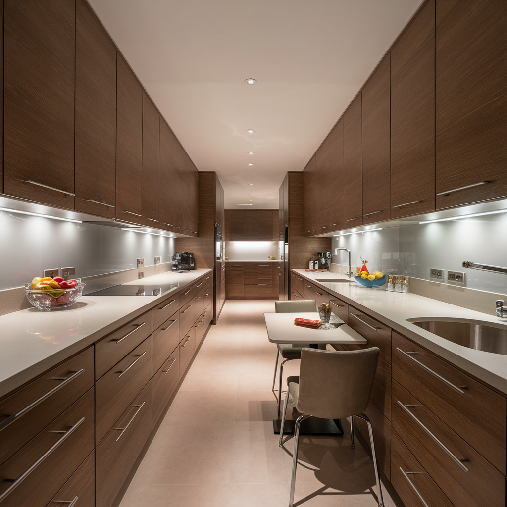 Making the balance between aesthetics and practicality is the art of combining style and function in a galley kitchen. Take into account that it delivers the effect of a luxury kitchen and add to this, resilience and affordability. Additionally, create functionality by using elements like proper lighting, energy-saving appliances, and clever storage devices that will manage to provide both a great look and a proper facility.