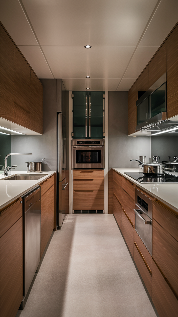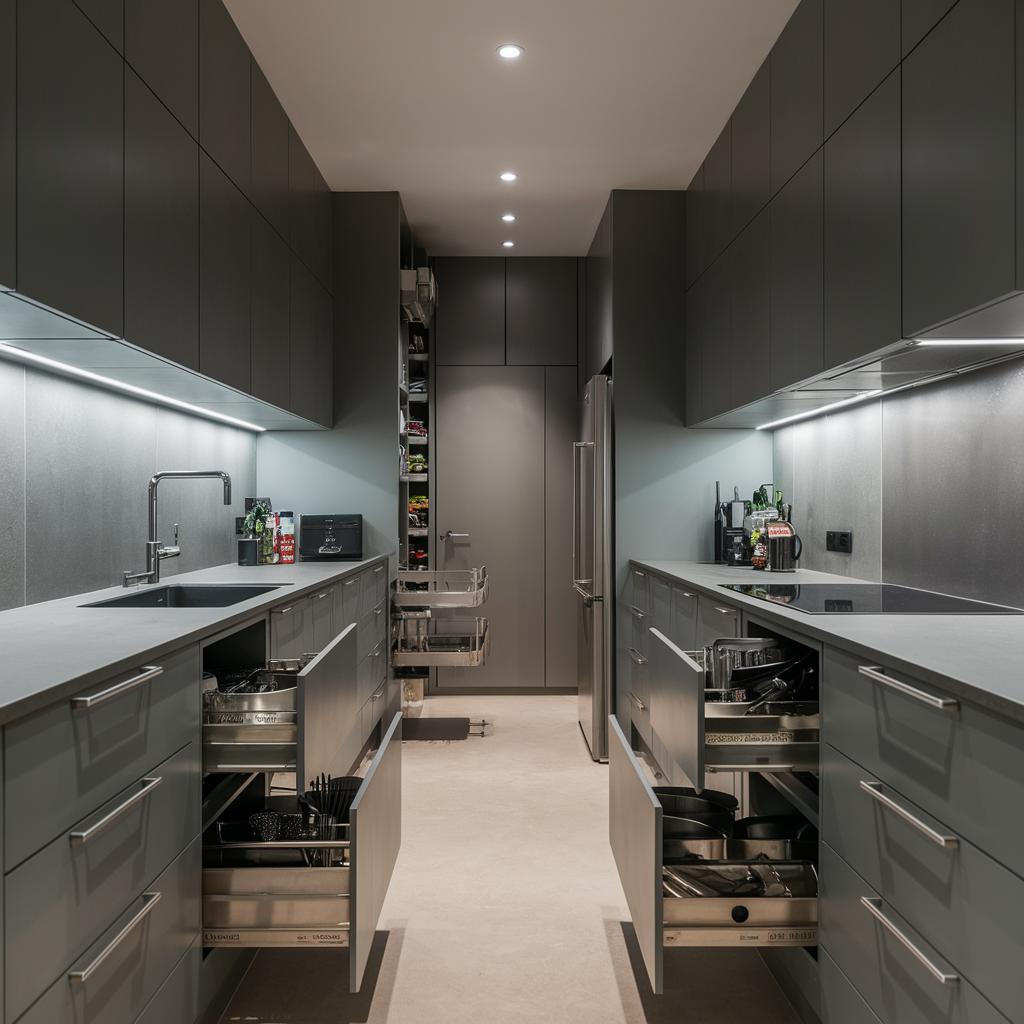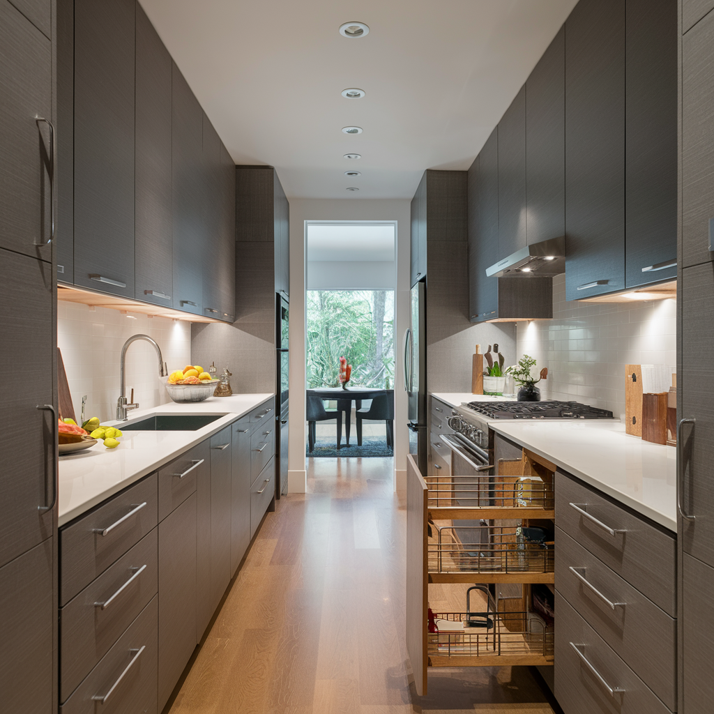 Maximum storage in a galley kitchen can be attained through smart solutions. To do this, provide pull-out shelves, lazy susans, and drawer organizers and make sure they are the most perfect storage. Make use of the most resilient materials and finishes, which besides offering a stylish look, will be able to put up with daily wear and tear, and incorporate the surfaces that are easy to clean.