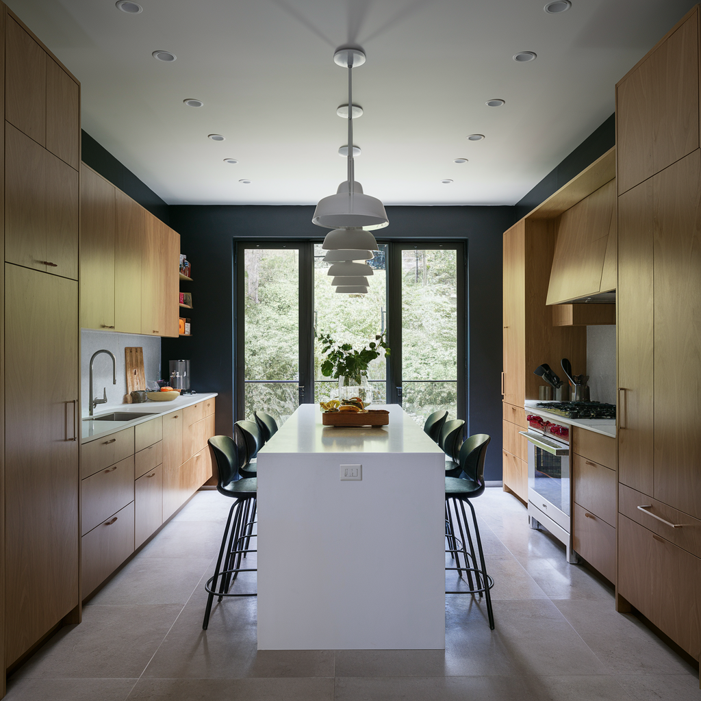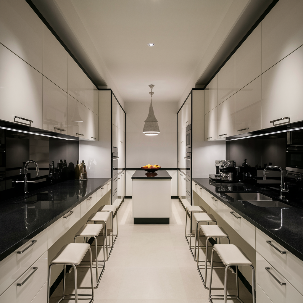 A little-known secret is that a galley kitchen with an island in it can be a game-changer. Unique galley kitchen island layouts include slim, elongated islands that provide additional prep space and storage without disrupting the flow. Seating on the island can also be a multifunctionathat makes it a space for dining and social gatherings among others.