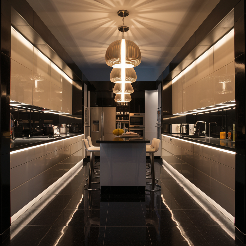 Lighting is one of the key stylistic elements that contribute to any galley kitchen. Task lighting, ambient lighting and accent lighting are all ideal parts of a space that is well illuminated and inviting. The under-cabinet lighting, meanwhile, can throw light on the countertops, while the pendant lights create a very good looking point over the sink or island.