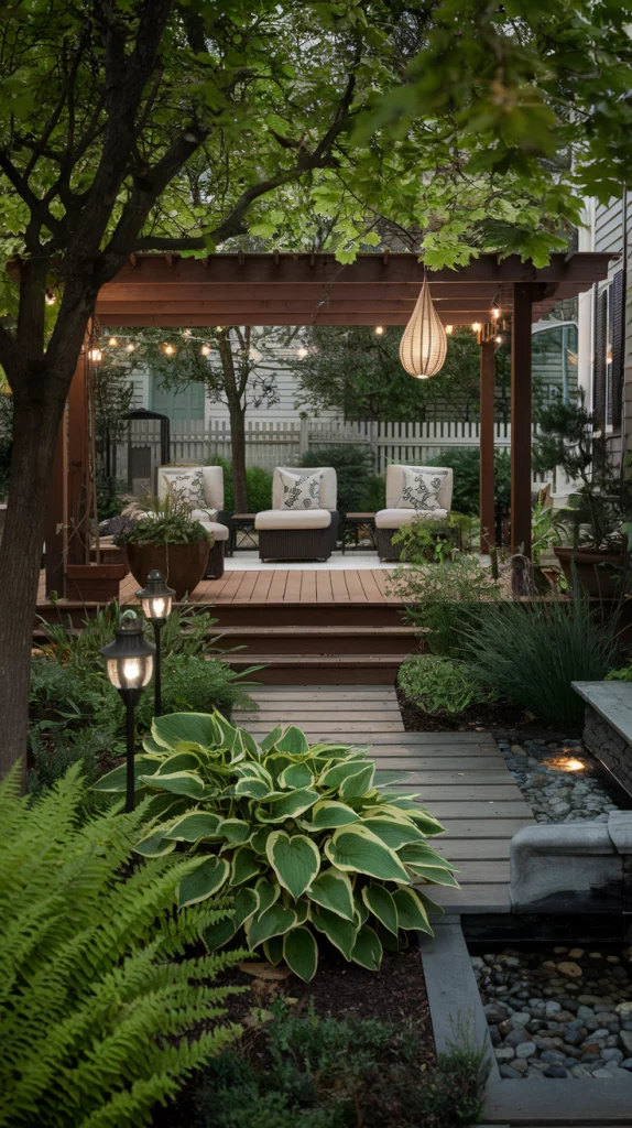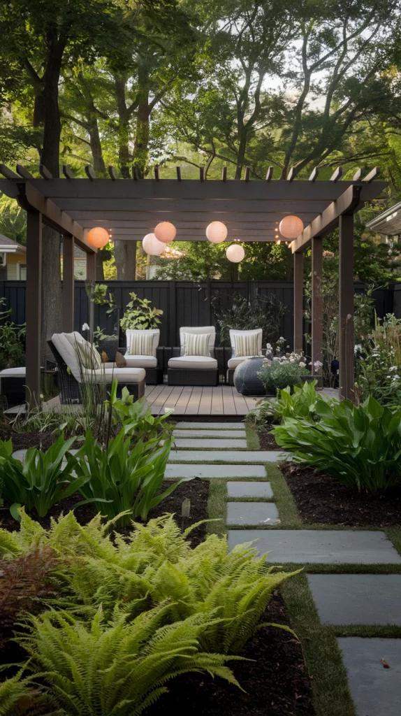 A shade garden provides relief during hot summers and can be both functional and beautiful. Use trees or pergolas to create natural shade, and plant shade-loving species such as hostas, ferns, and astilbes. Add a comfortable seating area with outdoor sofas or lounge chairs under the shaded area. Use soft lighting, like hanging lanterns or fairy lights, to enhance the cool, relaxing vibe in the evenings.