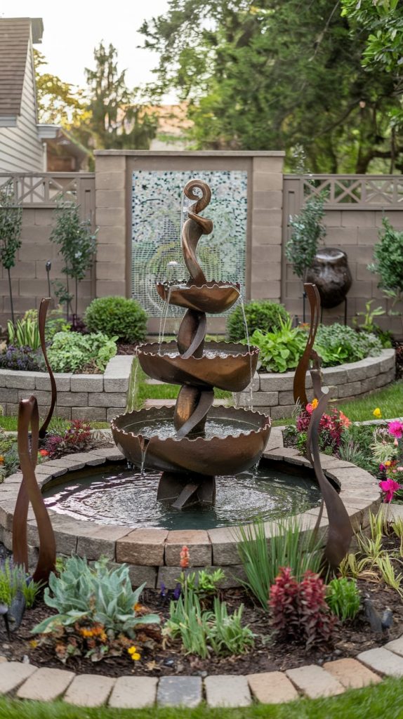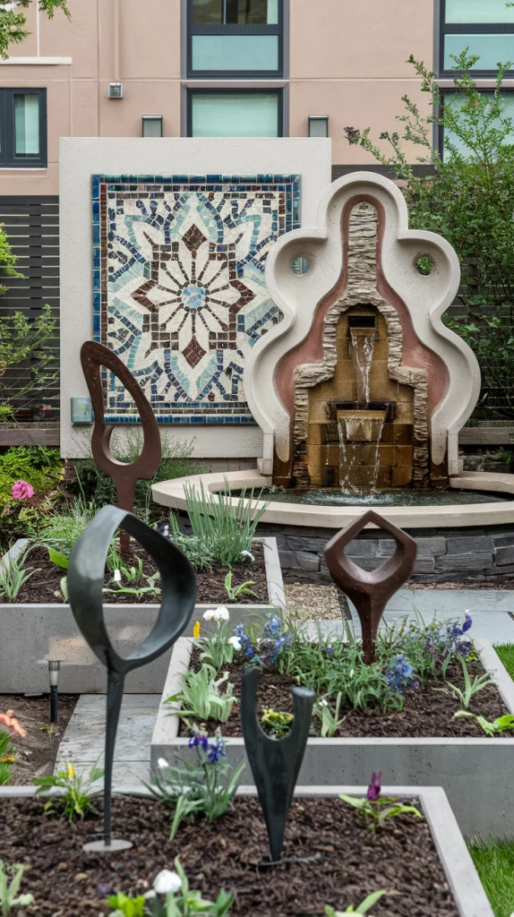 Add a creative touch to your backyard with artistic elements like sculptures, installations, or mosaics. Place metal or stone sculptures as focal points within flower beds or near pathways. Use garden walls or fences to display colorful mosaic panels or vertical art. Incorporate functional art, such as benches or water fountains with unique designs, to blend aesthetics with utility. This approach transforms your backyard into an outdoor gallery.