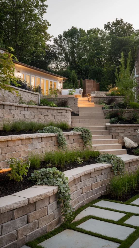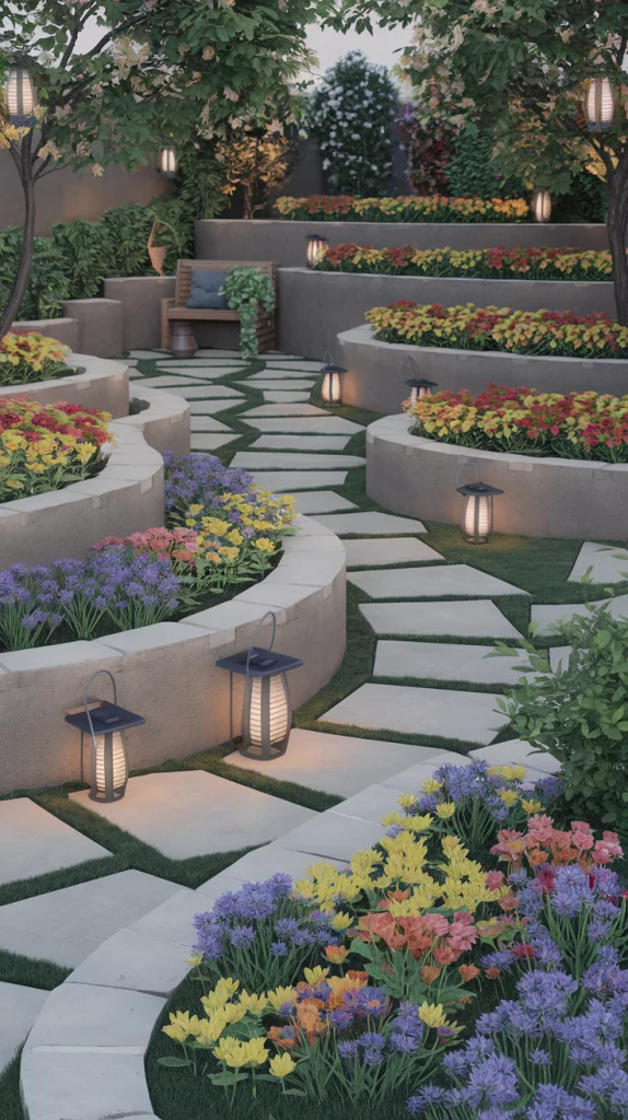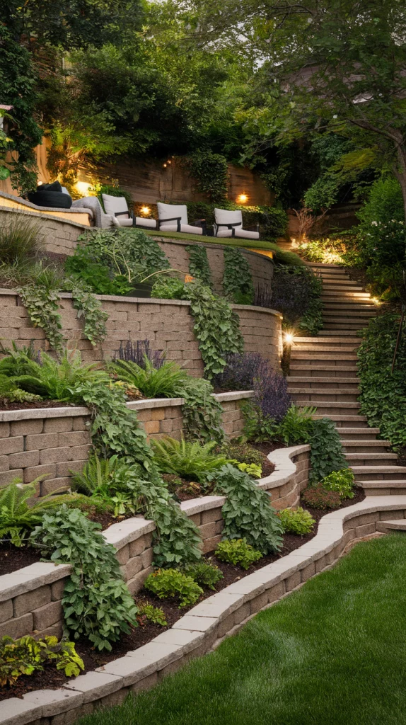 Sloped gardens can be transformed into stunning multi-level spaces. Build terraced retaining walls using stone or wood to create flat planting areas. Incorporate cascading plants, such as ivy or creeping phlox, for a softening effect. Add a winding stone staircase or pathway to connect each level, and place seating or a small deck on the upper tier to enjoy the view. Lighting along the stairs enhances safety and ambiance.