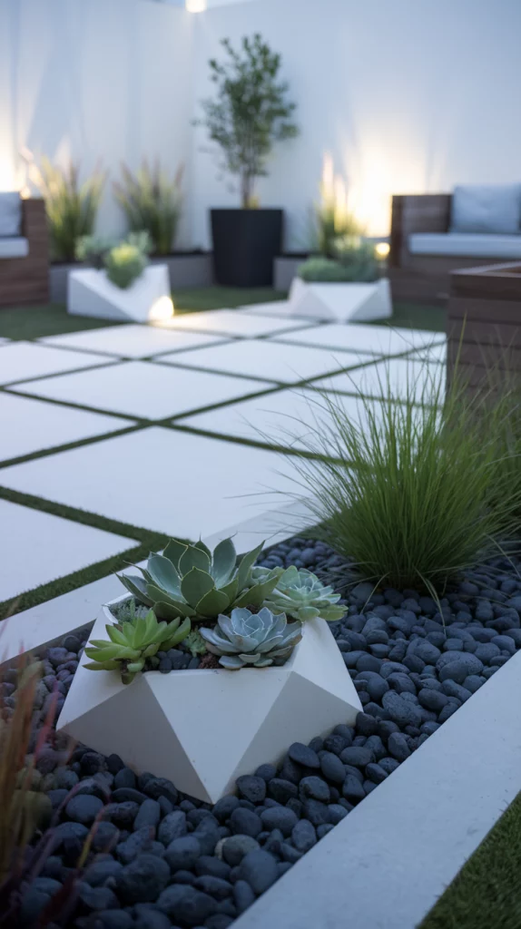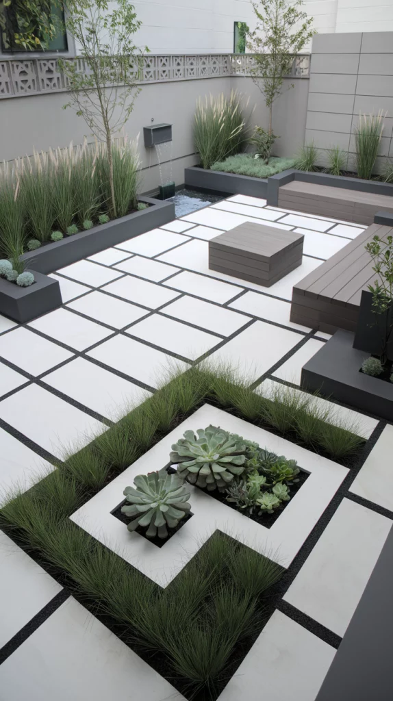 A minimalist garden focuses on clean lines, simplicity, and functionality. Use a neutral color palette with monochrome paving or decking. Incorporate low-maintenance plants like succulents, ornamental grasses, and evergreens arranged in geometric patterns. Include sleek, modern furniture with metal or wood finishes, complemented by subtle decor like planters or water features. The overall look should feel calm, spacious, and uncluttered—perfect for a contemporary outdoor space.
