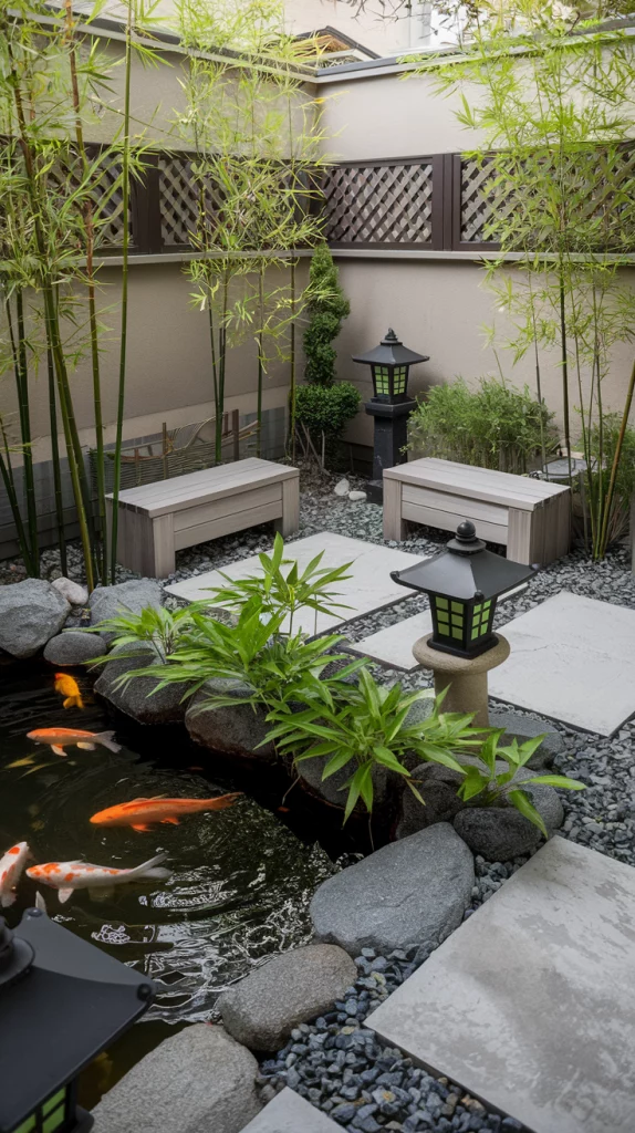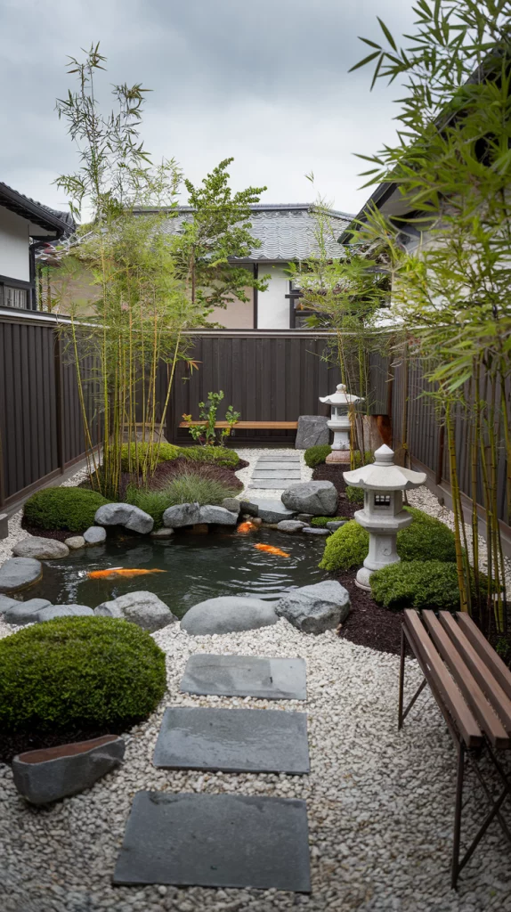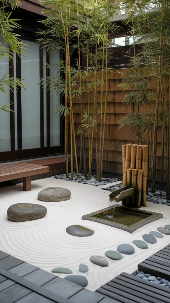A Zen garden transforms your backyard into a tranquil retreat. Use white sand or gravel as the base, arranging smooth stones and neatly raking patterns for texture. Add a bamboo water fountain or a small pond as a calming centerpiece. Minimalist furniture, like low wooden benches or stone stools, complements the serene aesthetic. Surround the garden with tall bamboo or shrubs for privacy. This design is ideal for relaxation and meditation.