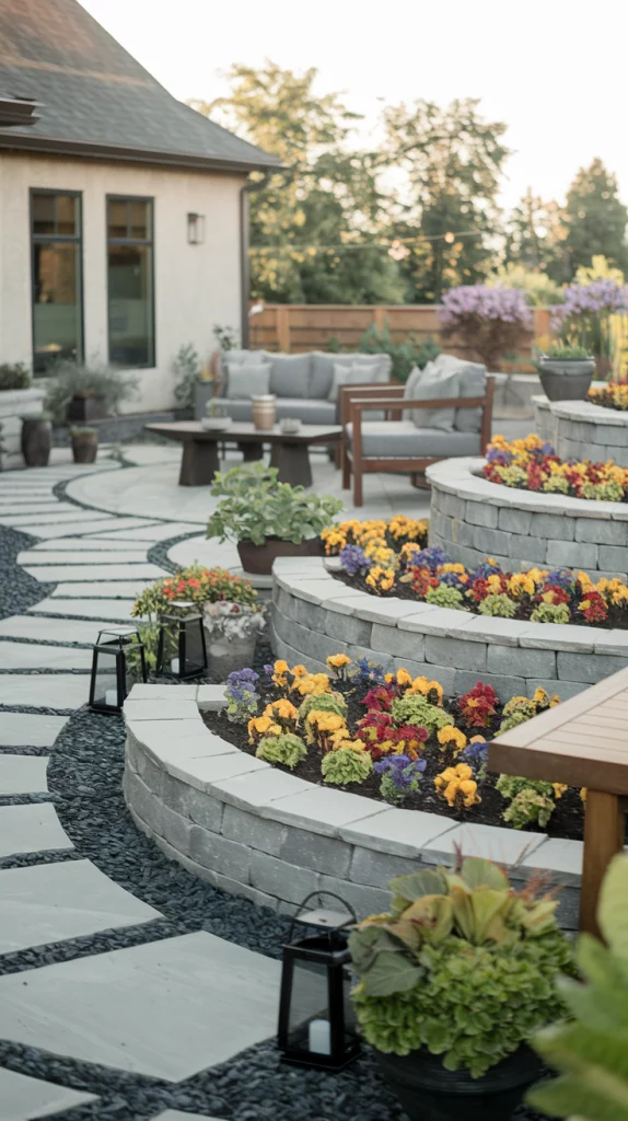A well-designed backyard garden layout is the foundation for a stunning outdoor retreat. Divide your backyard into functional zones, including seating areas, pathways, and plant beds. Use curved garden paths, tiered flower beds, and open green spaces to create a harmonious flow. Weather-resistant furniture with earthy-toned cushions, small statues, solar-powered lanterns, and potted plants complete the look. This layout strikes the perfect balance between structure and natural beauty.