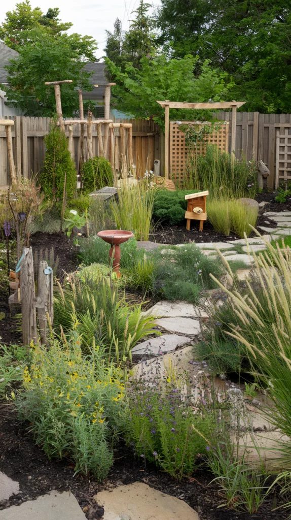 A native plant garden is eco-friendly, low-maintenance, and supports local wildlife. Choose plants that naturally thrive in your region’s climate, such as wildflowers, grasses, and shrubs. Arrange them in clusters to mimic their natural environment. Include a birdbath, birdhouses, or bee hotels to attract pollinators and birds. This design not only conserves water but also creates a harmonious ecosystem in your backyard.