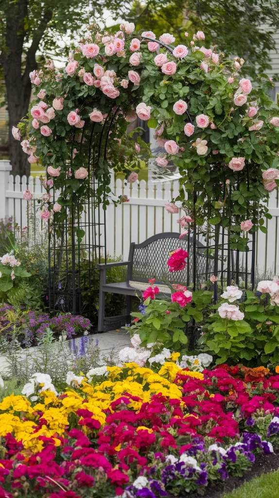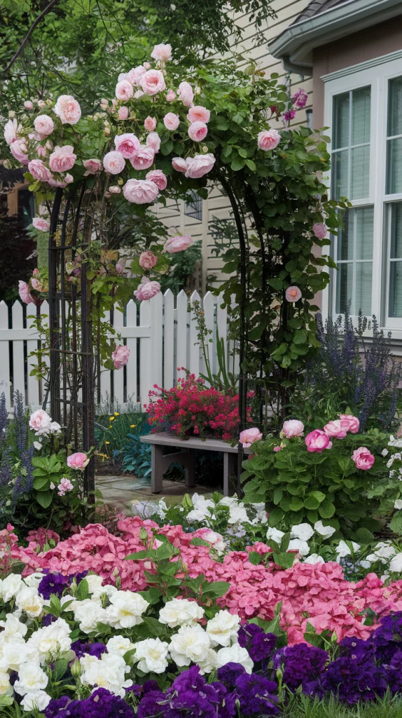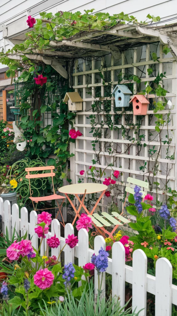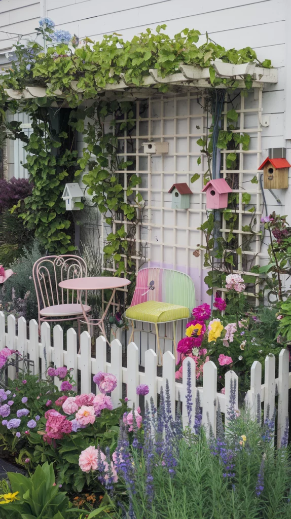 Transform your backyard into a whimsical escape with a cottage garden. Fill the area with vibrant flowers such as roses, daisies, and peonies. A white picket fence or trellis adds charm, especially when covered with climbing vines. Include a cozy seating area with a pastel-colored bistro set, and enhance the space with birdhouses, lanterns, and garden arches for extra depth.