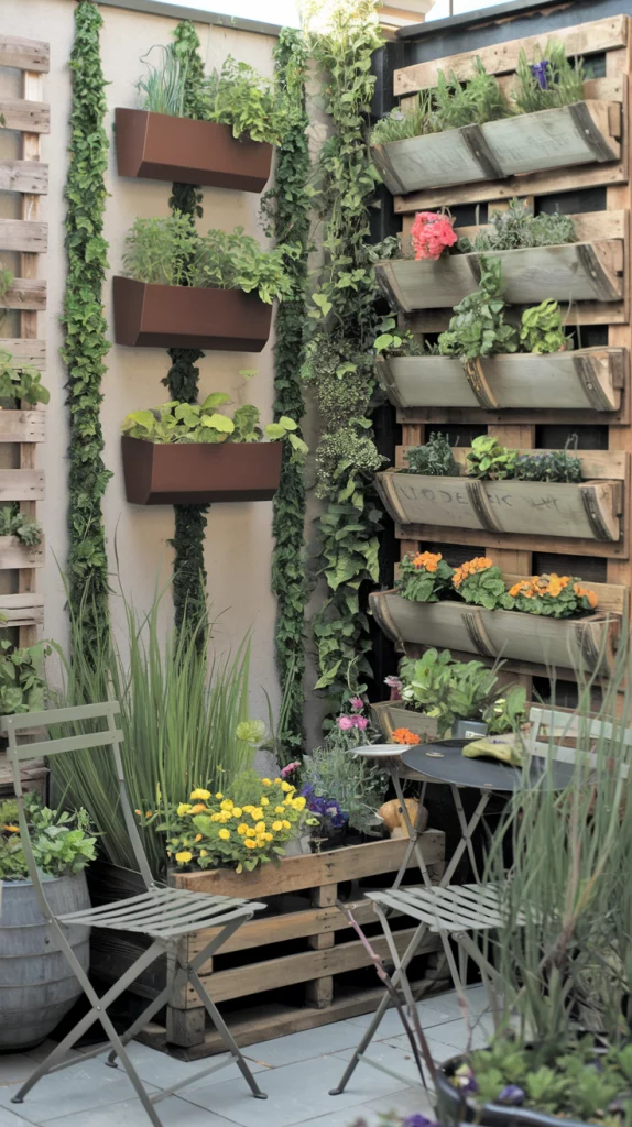 Maximize space in a small backyard with a vertical garden. Use wall-mounted planters, wooden pallets, or metal grids to grow climbing plants, flowers, or herbs. A trellis with hanging pots adds variety and charm. Pair this with slim, foldable outdoor furniture to maintain functionality. Vibrant green plants and colorful flowers against neutral walls create a fresh, modern look. This is a practical solution for compact spaces.