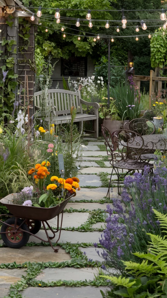 A rustic garden brings a touch of countryside charm to your backyard. Use natural materials like reclaimed wood, stone pathways, and wrought iron furniture. Fill the space with wildflowers, lavender, and tall grasses for a relaxed, untamed look. Add rustic decor, like a vintage wheelbarrow filled with flowers or a weathered watering can planter. String lights provide soft, cozy lighting for evening enjoyment.
