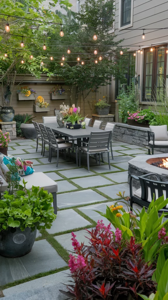 A patio garden serves as the perfect spot for outdoor gatherings. Use durable stone or concrete flooring and define the space with planters filled with vibrant greenery. Add a large dining table with weather-resistant chairs, surrounded by potted trees or shrubs. Include string lights, an outdoor heater, or a fire pit for evening ambiance. Decorate with colorful cushions and a centerpiece of fresh flowers for a warm and inviting atmosphere.