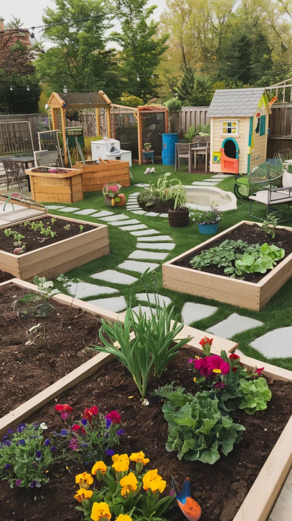 Design a backyard garden that combines fun and education for children. Include raised beds or small plots where kids can plant and tend their own flowers, herbs, or vegetables. Add interactive elements like stepping stone pathways, butterfly houses, and sensory plants with different textures and scents. Include child-sized benches, a sandbox, or a small playhouse to make the space even more inviting. A kid-friendly garden encourages creativity, exploration, and a love for nature.