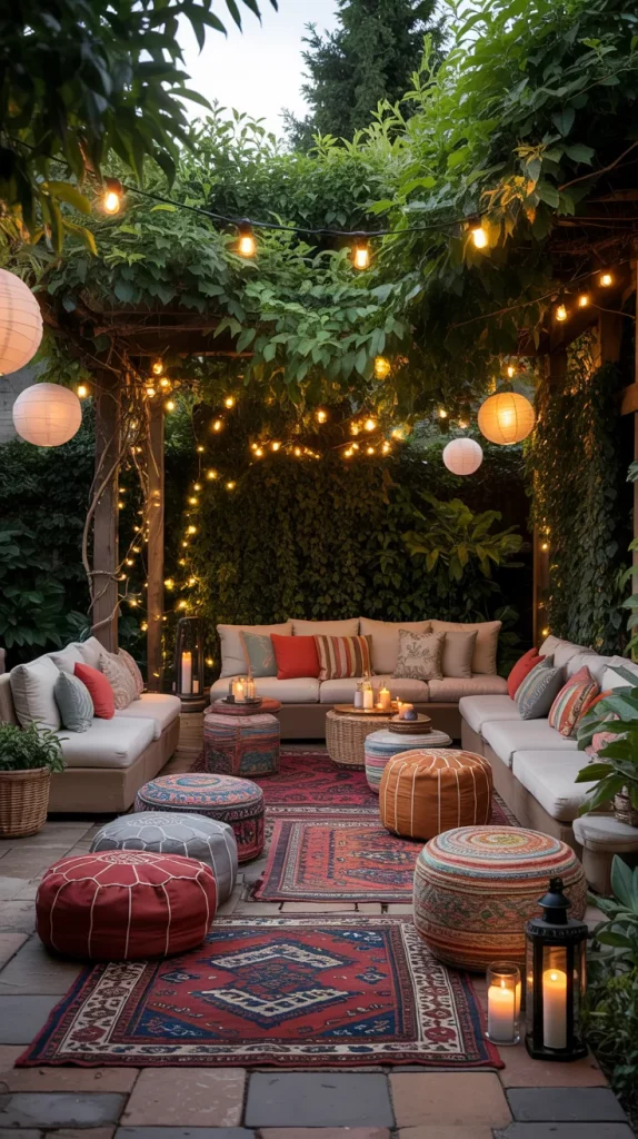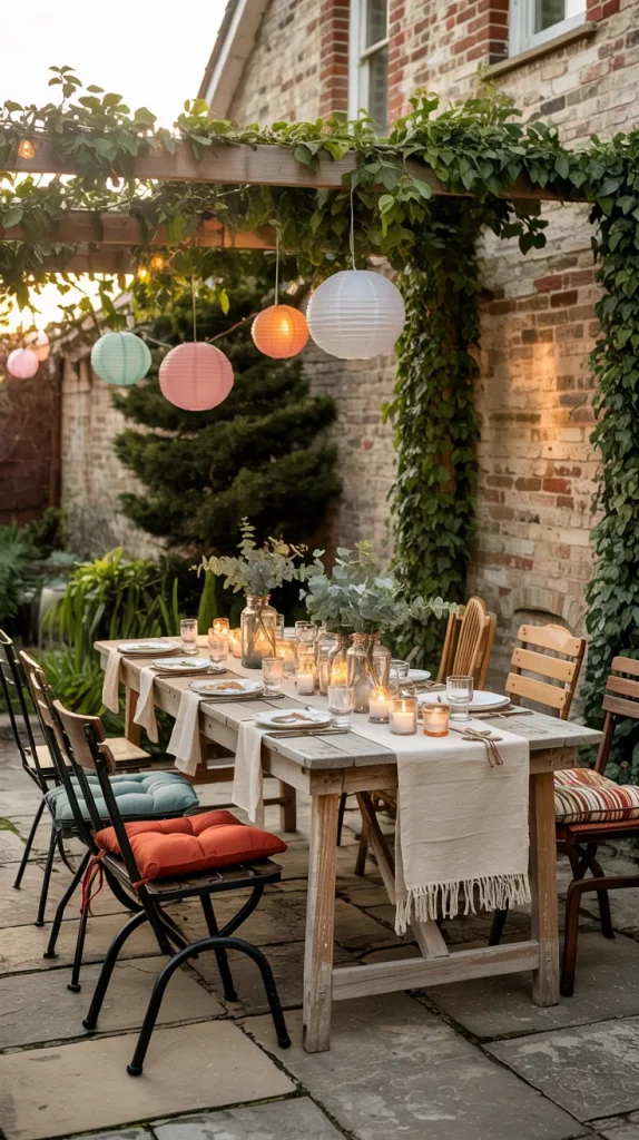 I use string lights overhead to define the space and create a cozy canopy effect. Lanterns and pathway lights help guide movement, while candles add intimacy to dining and lounge areas. Solar-powered options are particularly practical, as they are energy-efficient and easy to install.