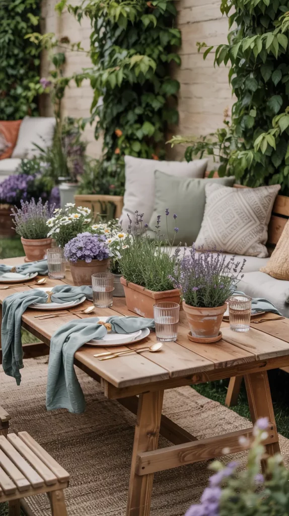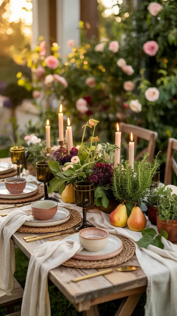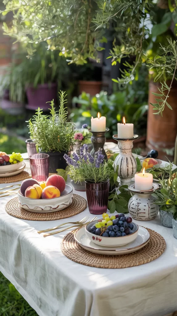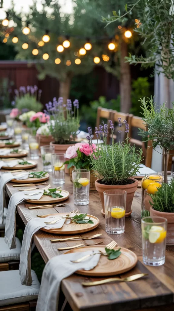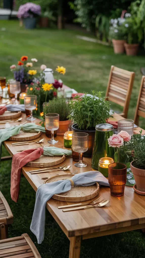 Table styling is a defining feature of garden party design trends 2026, and I always treat it as a focal point. I prefer layered table settings that combine textures, such as linen tablecloths, woven placemats, and ceramic dishware. This layered approach creates depth and makes the table feel more inviting.