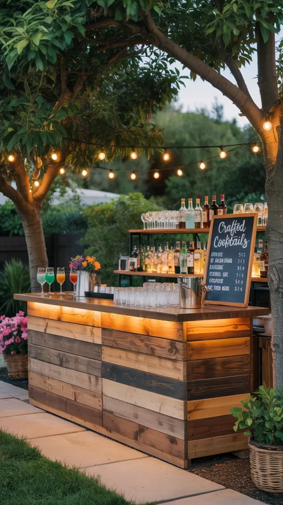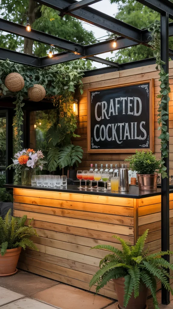 An outdoor bar is a standout feature in garden party setup ideas 2026, and I always design it as both a functional and decorative element. I typically position the bar in an easily accessible area while ensuring it does not disrupt the flow of the event. Using natural materials like wood or stone helps integrate the bar seamlessly into the garden environment.