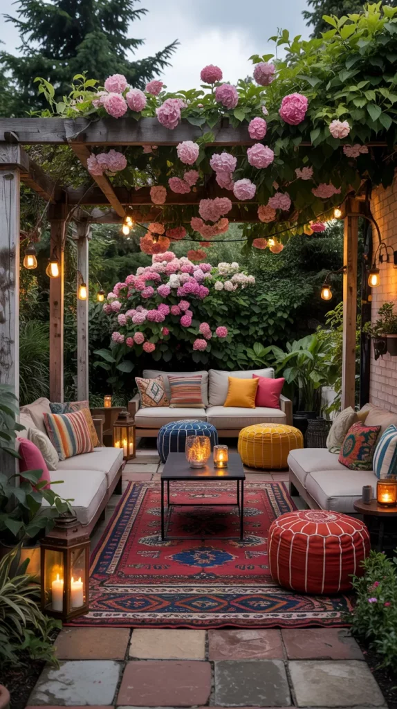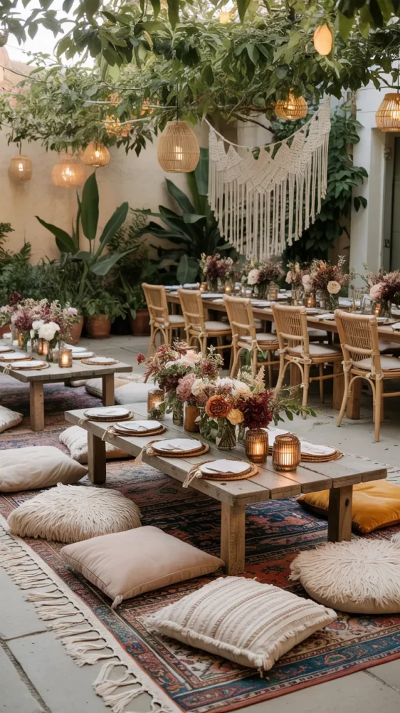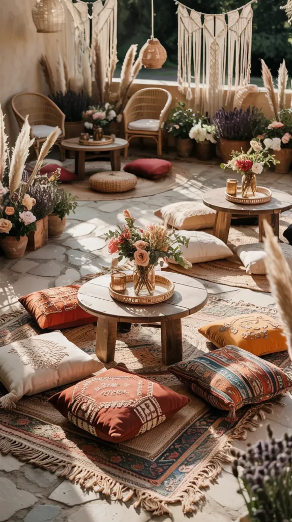 For furniture and decor, I rely on rattan chairs, wooden low tables, and floor cushions in earthy tones and subtle prints. Macramé accents, woven lanterns, and dried floral arrangements help reinforce the bohemian aesthetic. I also incorporate throws and lightweight blankets to ensure comfort as the evening progresses, making the space feel cozy and intentional.