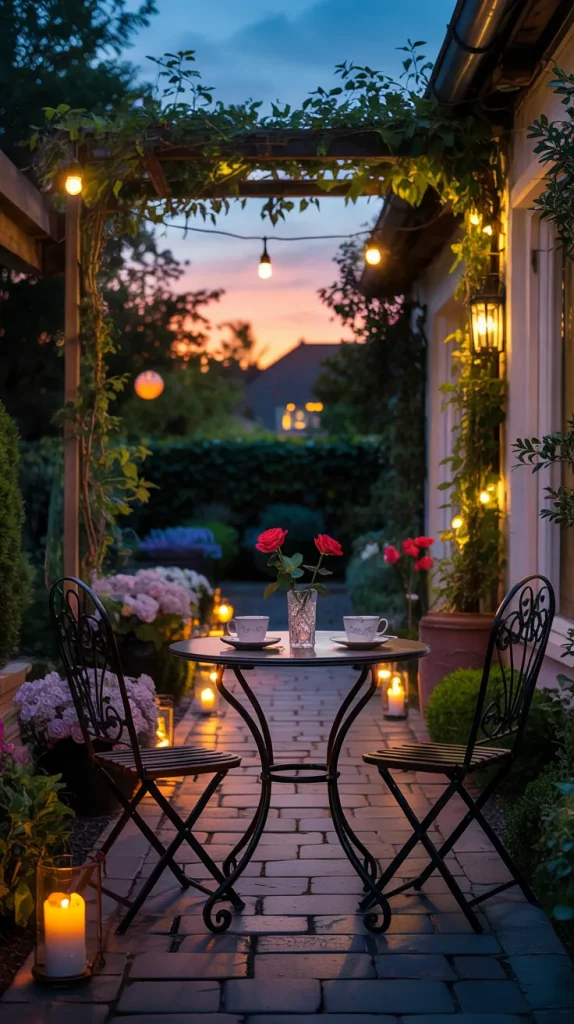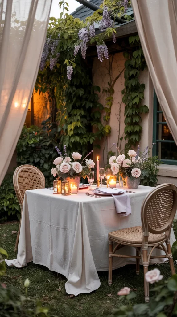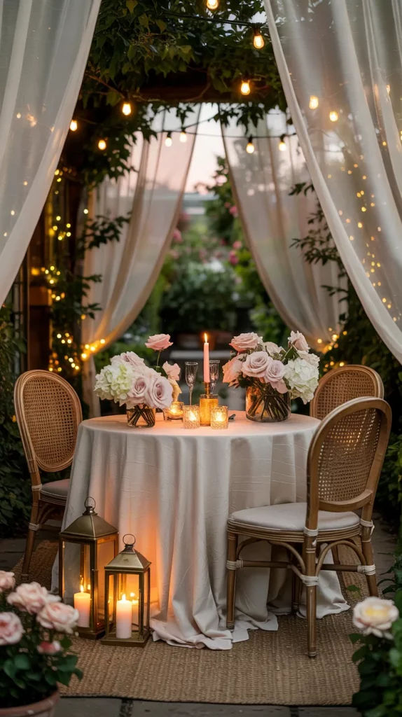 I usually select elegant furniture such as a small bistro table, upholstered chairs, and delicate tableware. Linen tablecloths, candles, and floral centerpieces are essential elements that bring the entire design together. I also like to incorporate layered lighting, including lanterns and string lights, to create a warm glow as the evening progresses.