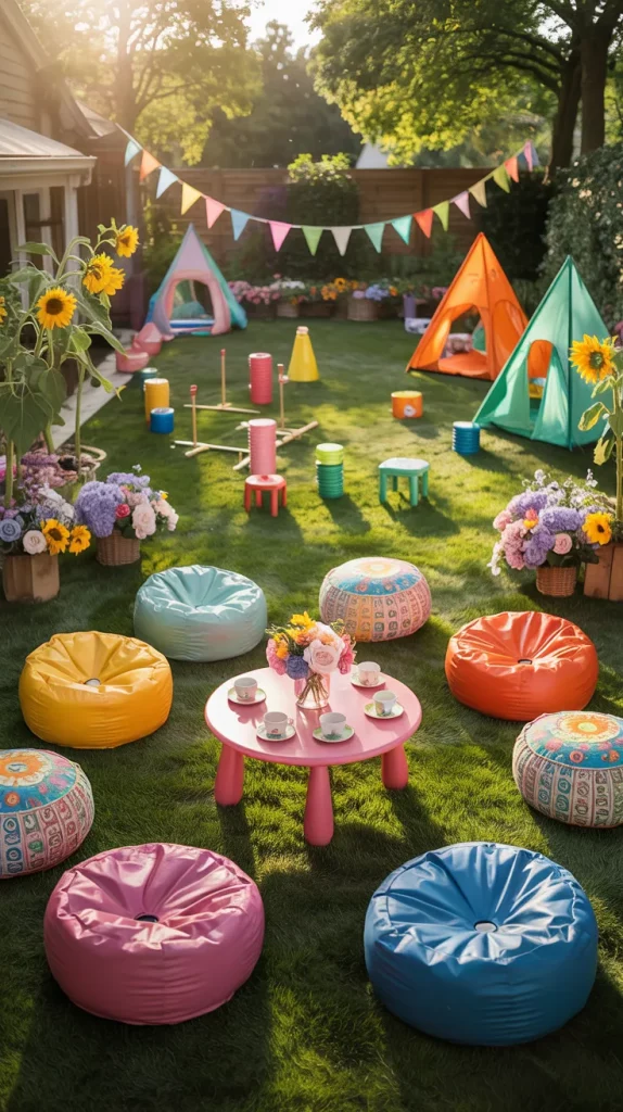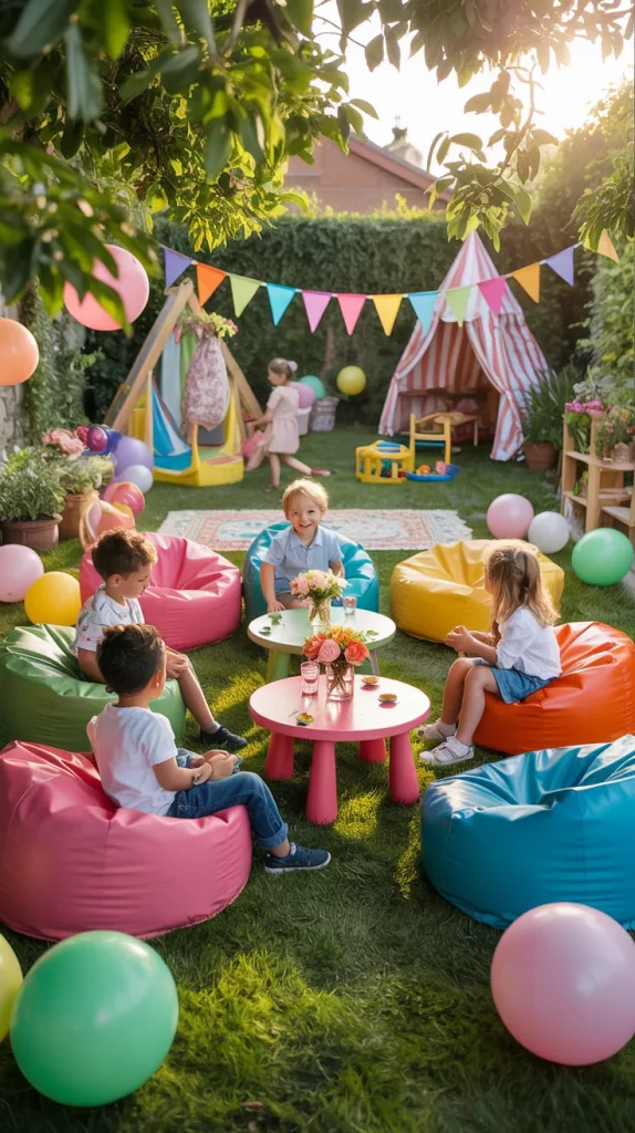 I typically use low seating like poufs, bean bags, and small tables designed for children. Activity stations such as craft tables, mini play tents, or outdoor games are essential. I also recommend using washable tablecloths and unbreakable dishware to maintain practicality.