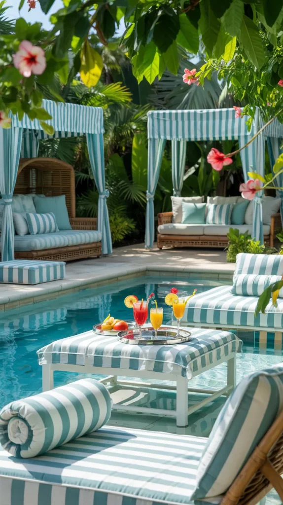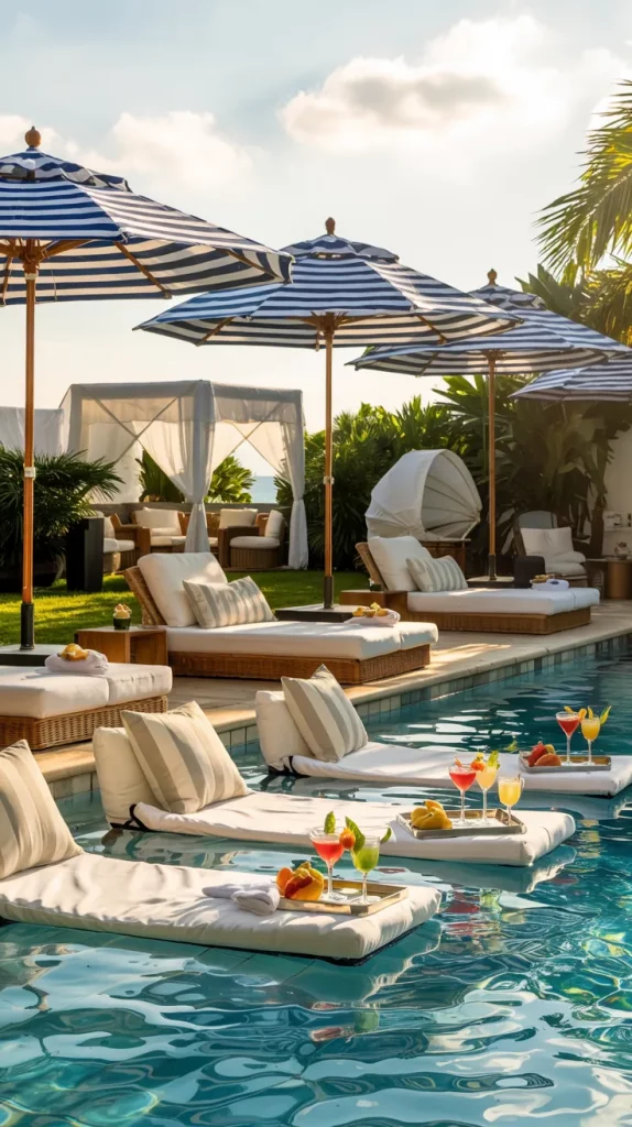 I usually incorporate lounge chairs, cabanas, and side tables arranged around the pool. Towels, umbrellas, and outdoor cushions should match the color palette for a cohesive look. I also recommend adding a bar cart or floating trays to enhance functionality and convenience.