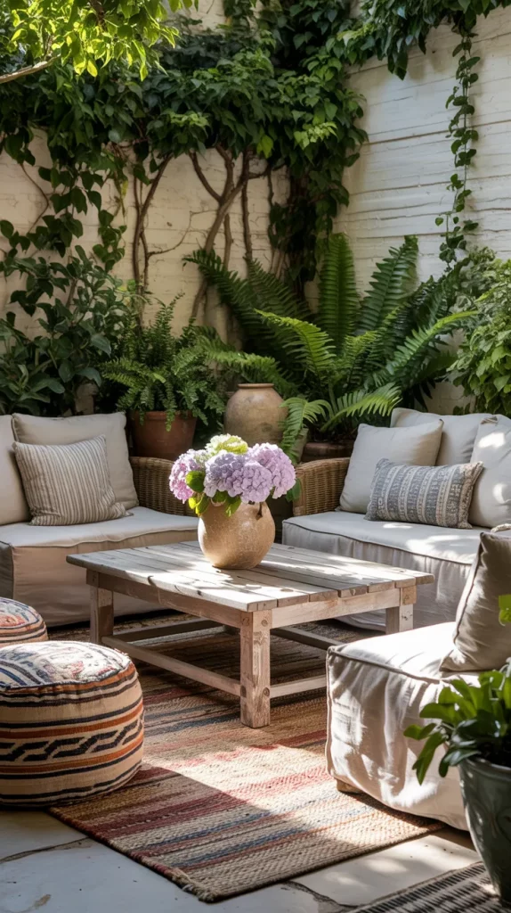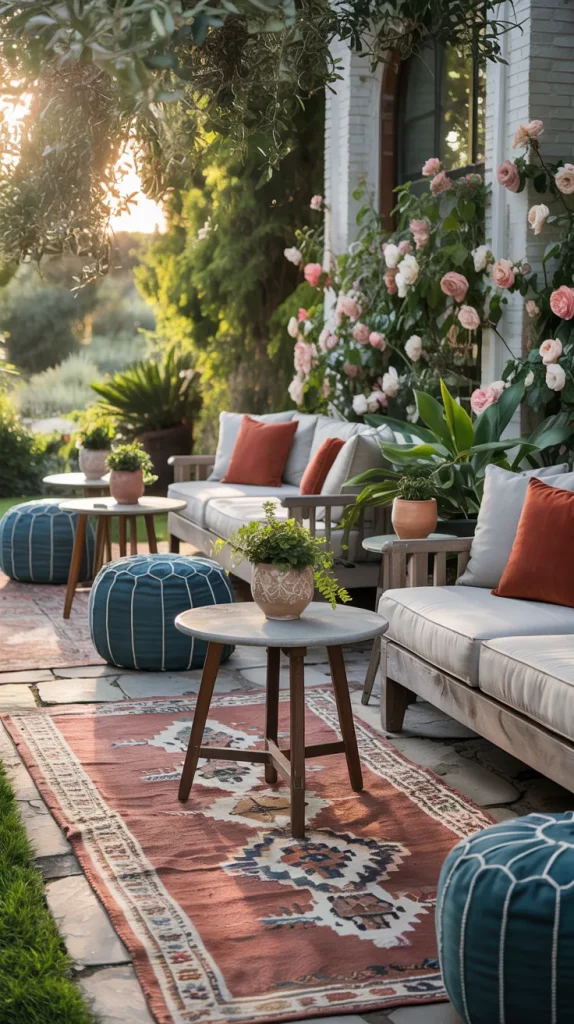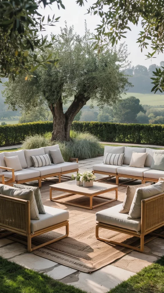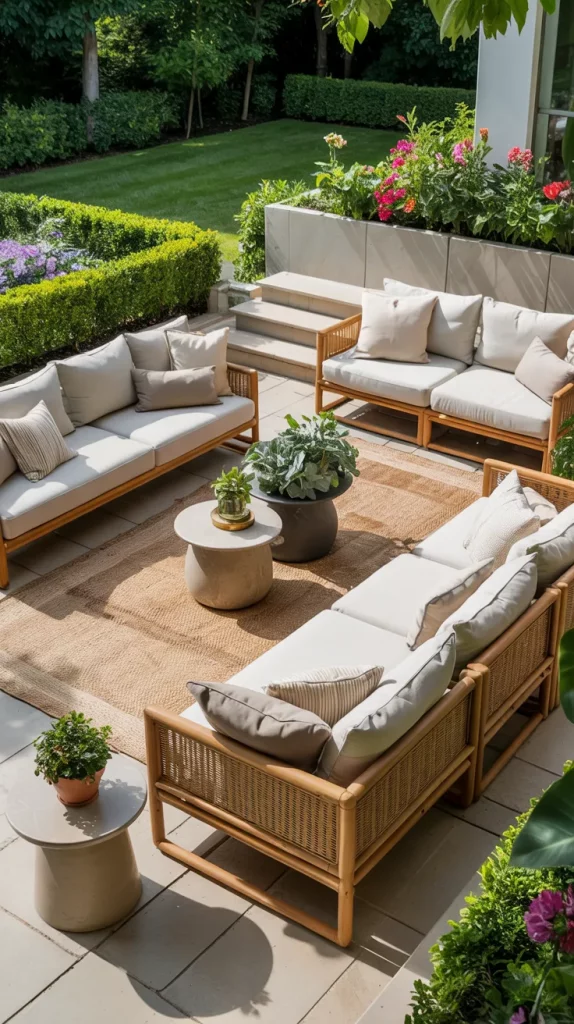 I carefully select furniture that balances comfort with durability. Upholstered outdoor sofas, weather-resistant cushions, and layered throws help create a relaxed yet refined look. I also include side tables or small coffee tables so guests have convenient surfaces for drinks and snacks. Rugs designed for outdoor use help define the space and add warmth underfoot, making the lounge area feel like an extension of an indoor living room.