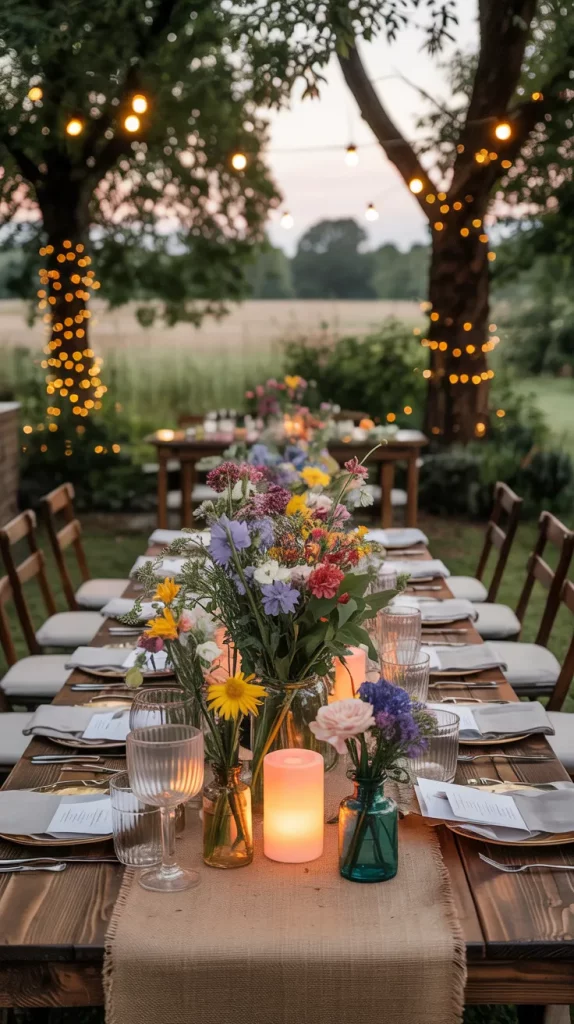 I incorporate elements such as reclaimed wood furniture, burlap table runners, and simple ceramic or enamel dishware. Fresh greenery, wildflowers, and even herbs can be used as decor, reinforcing the natural theme. Lighting often includes lanterns or soft string lights to maintain a cozy, countryside feel.
