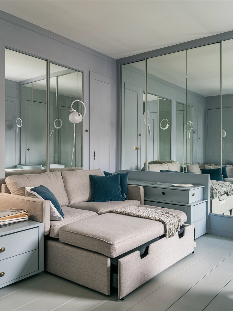 If you want to have a small area that has the effect of a spacious one by integrating gray and blue living room ideas, make sure you allow enough free room to move around and don’t clutter up every corner. Light colors can take up less space and give the illusion of more space over dark colors. Use functional furniture such as multipurpose beds, coffee tables that have storage, or retractable desks, to make the most of the space. Mirrors and spotlights are two design tactics that can make the room more expansive.