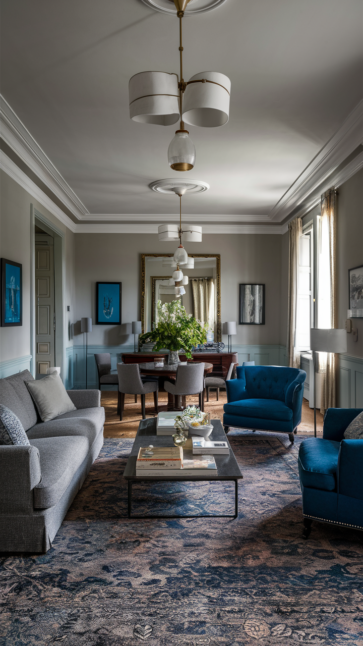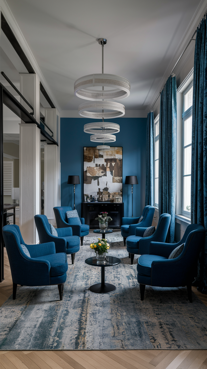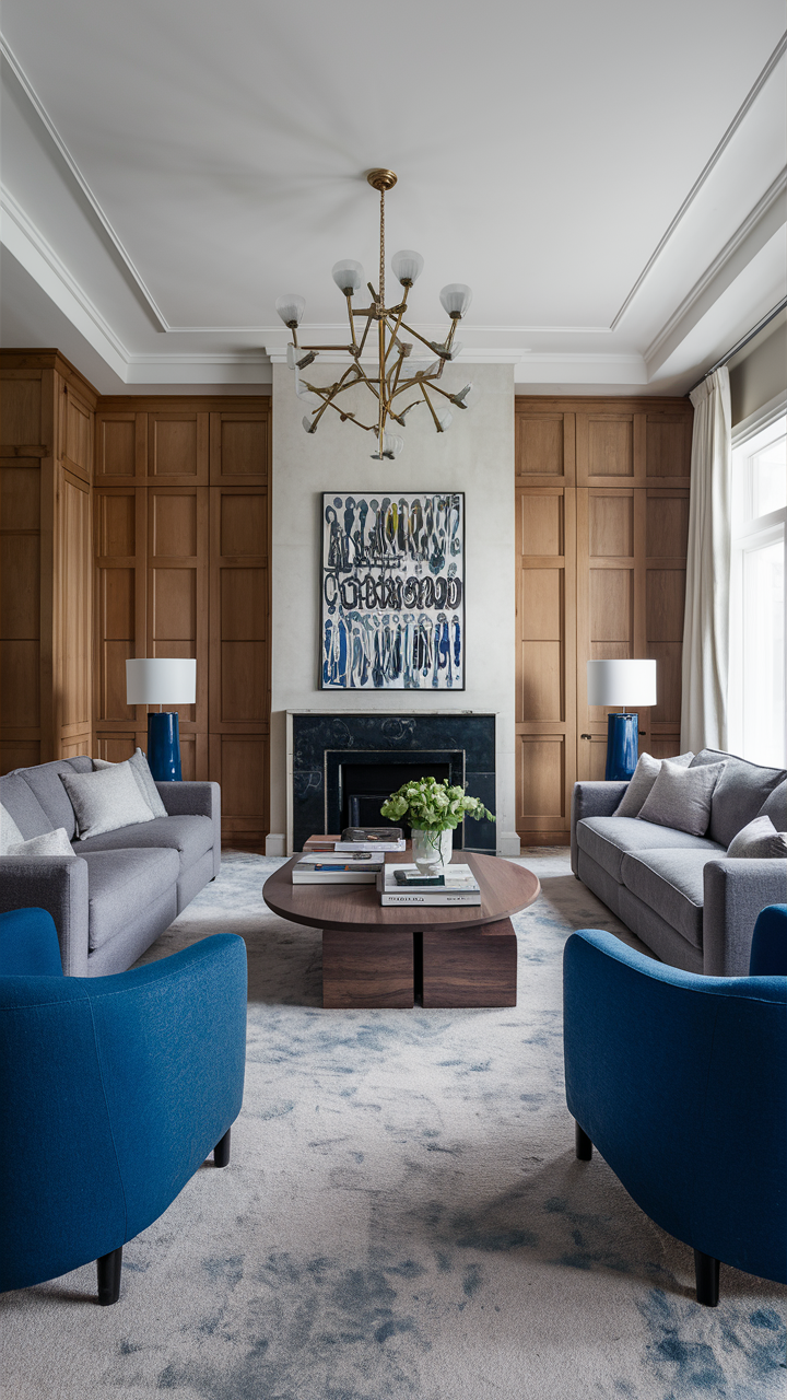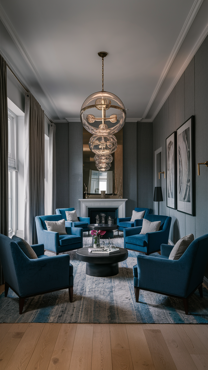A lot of charming blue armchairs in a well-designed gray and blue living room can help you get a refined and high-class look. Blue armchairs can be a better choice since they offer both comfort and style, and their positions provide a private conversation area.