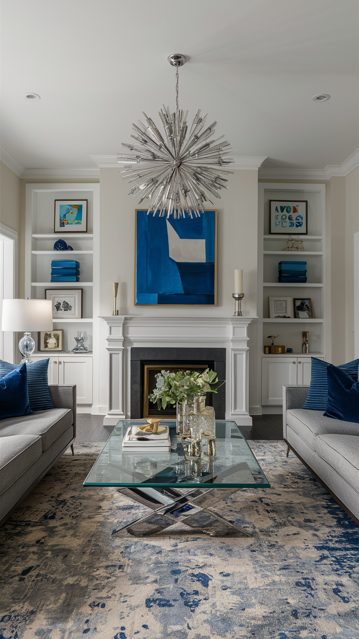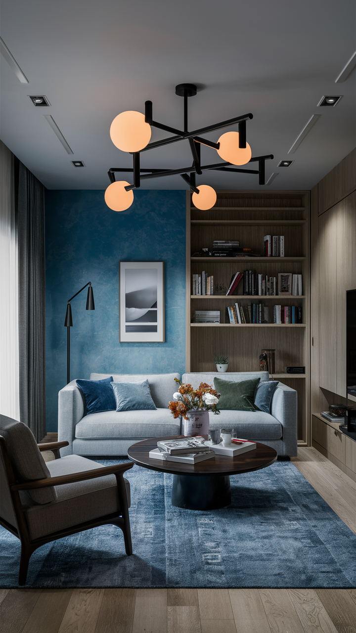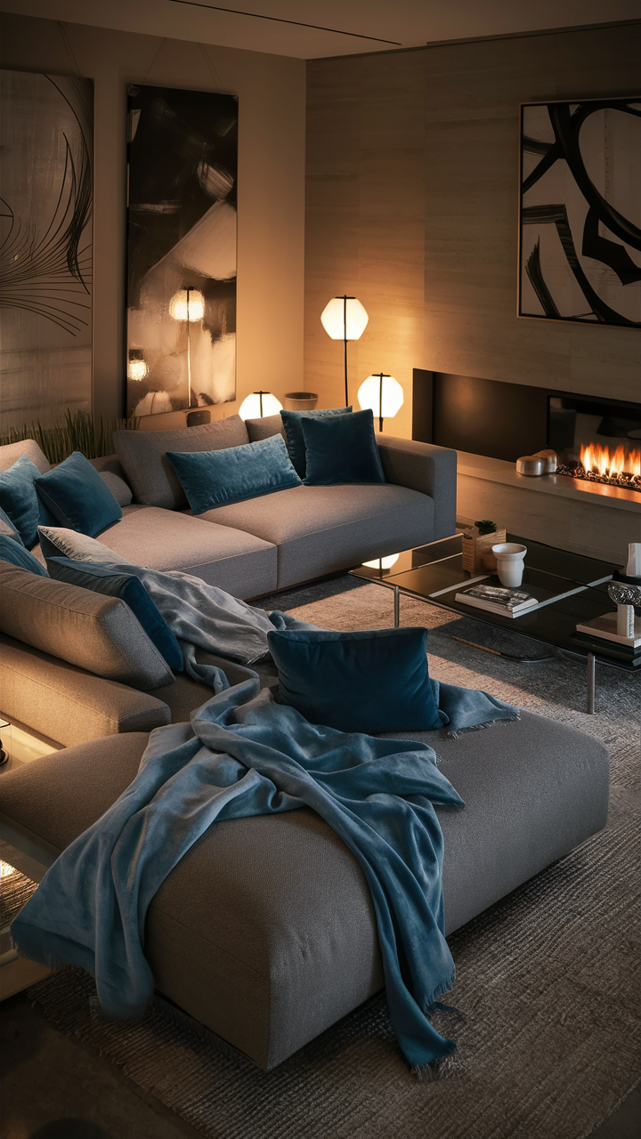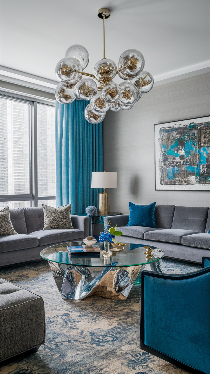 Setting up lights properly is important to show off your design of gray and blue living rooms. Use various kinds of lighting, task, and ambient light to create a comfortable mood and warmth. Think about adding lamps such as standing ones, desk lamps, and also ceiling fixtures that perfectly fit in with the rest of the room’s aesthetics.