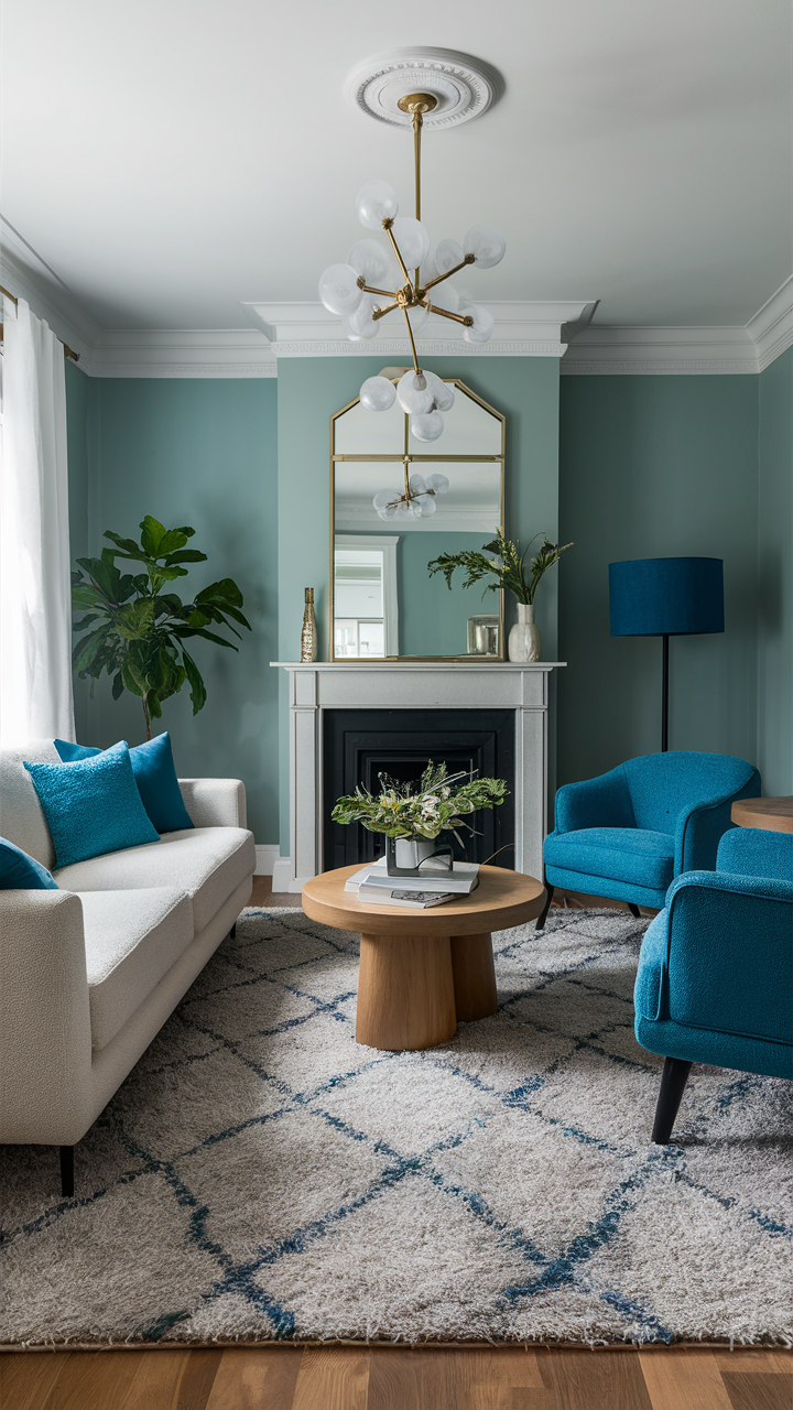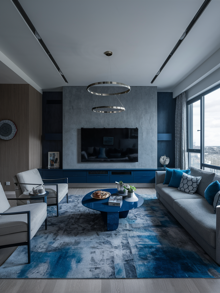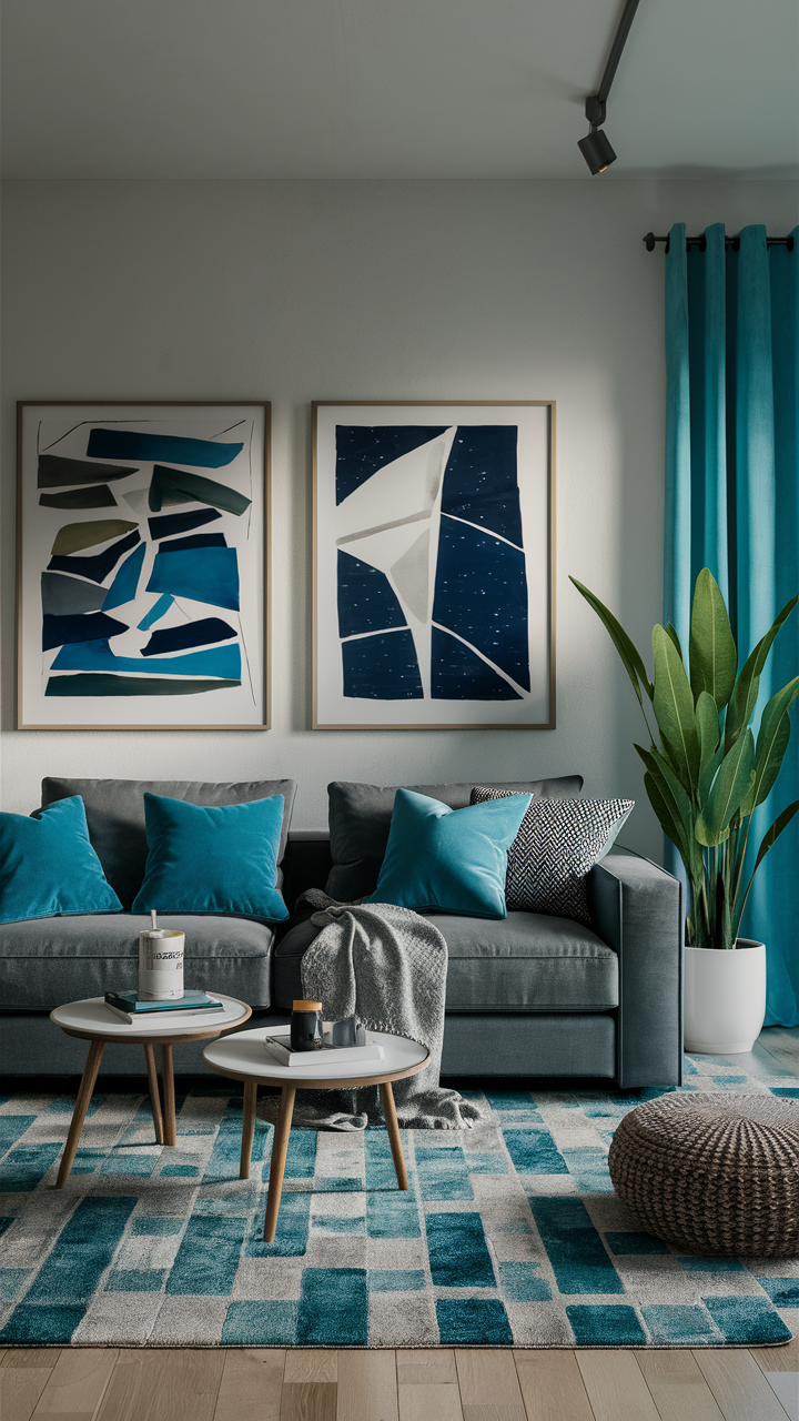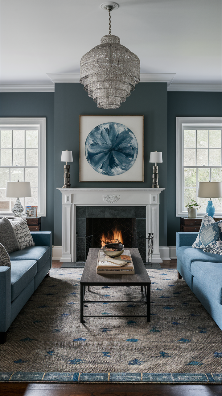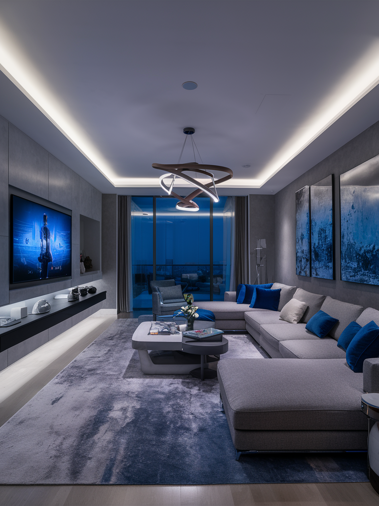 Setting up lights properly is important to show off your design of gray and blue living rooms. Use various kinds of lighting, task, and ambient light to create a comfortable mood and warmth. Think about adding lamps such as standing ones, desk lamps, and also ceiling fixtures that perfectly fit in with the rest of the room’s aesthetics.