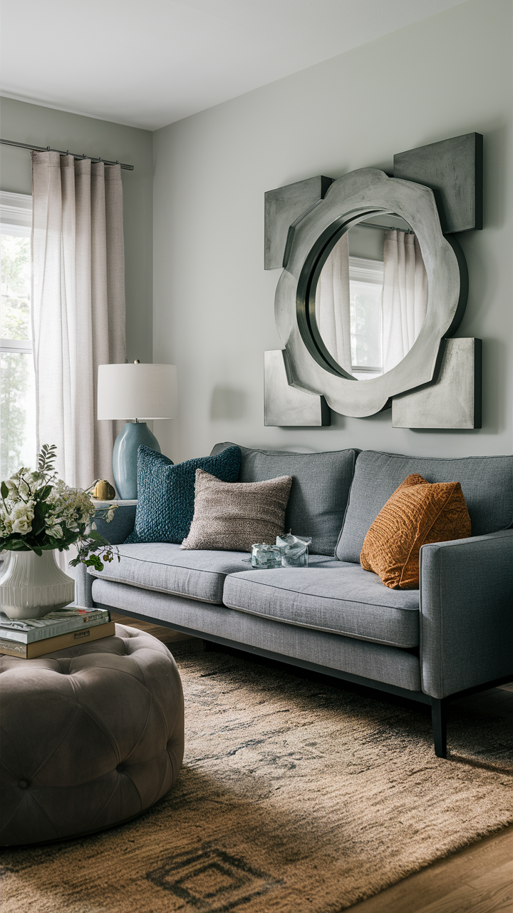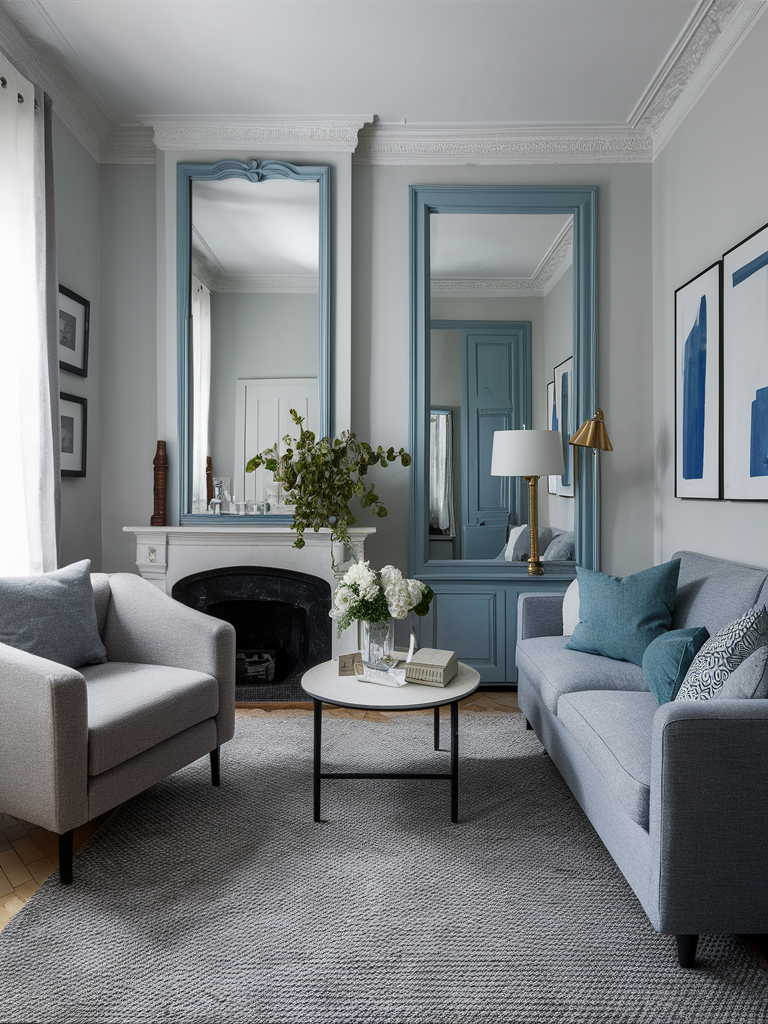 One of the best ways to add a greal feature to the gray with blue living room walls is adding a statement mirror. A mirror, which has a gray or blue frame with a pattern that stands out in the room, is a hot item. Primarily, mirrors add the quality of elegance to the room but also create a sense of spaciousness and light with their reflective surfaces.