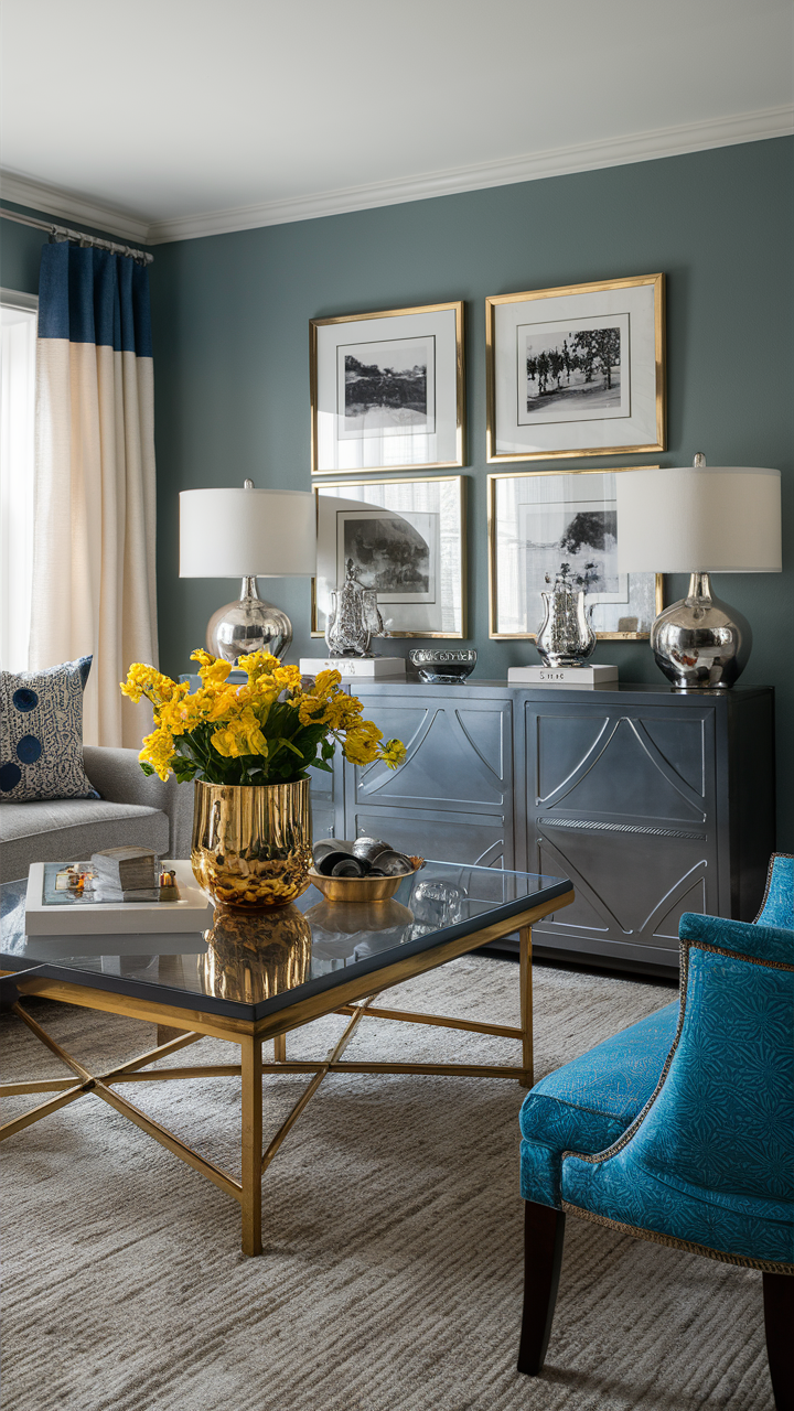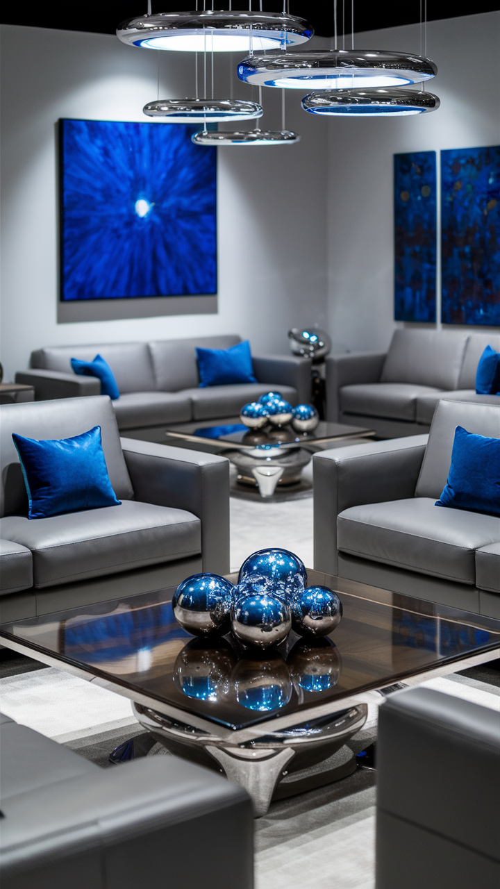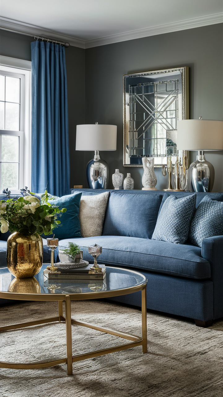 Gray and blue rooms can be dull, so glitz and glam is one of the most interesting things you can inject into the room to enhance its appeal. For instance, you can choose objects like gold, silver vases displayed, picture frames, and lamp bases. It is these shiny possibilities that will bring the whole room to life by their contra-color effects with the blue and gray textures alongside, thus strengthening the appearance and layout of the area.