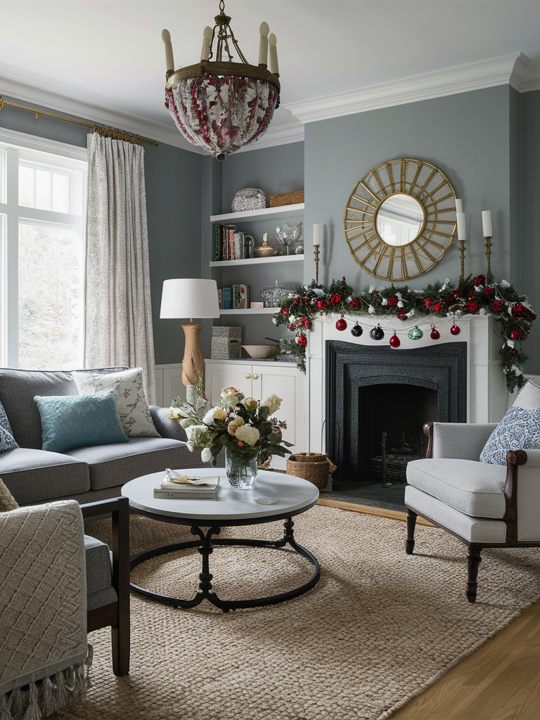 A fresh and dynamic look can be achieved by decorating your gray and blue living room with seasonal decorations. Swap out throw pillows, blankets, and small decor items to reflect the current season. For example, light, airy fabrics and floral patterns can be included in the spring, or warm, cozy textures and festive ornaments in winter holidays.