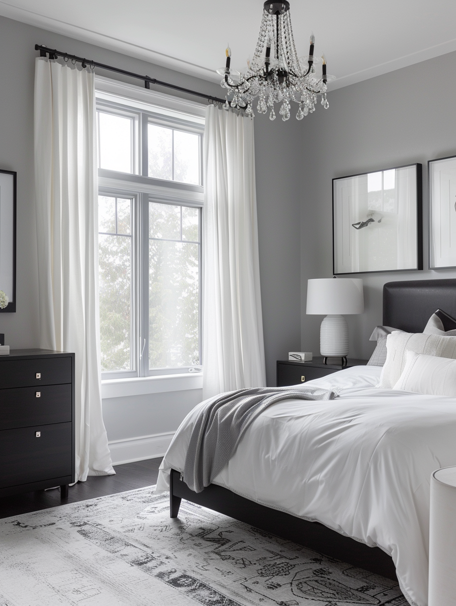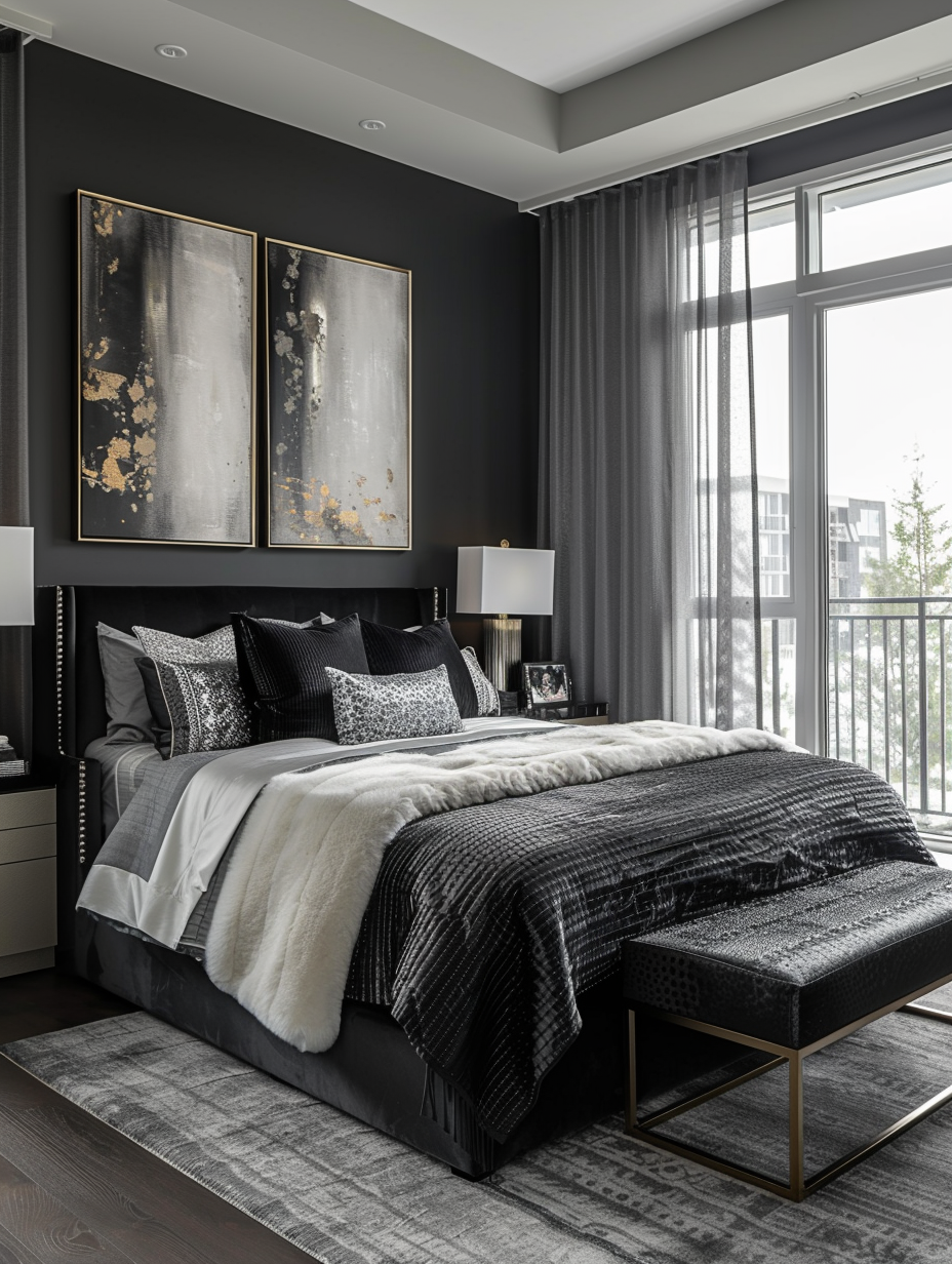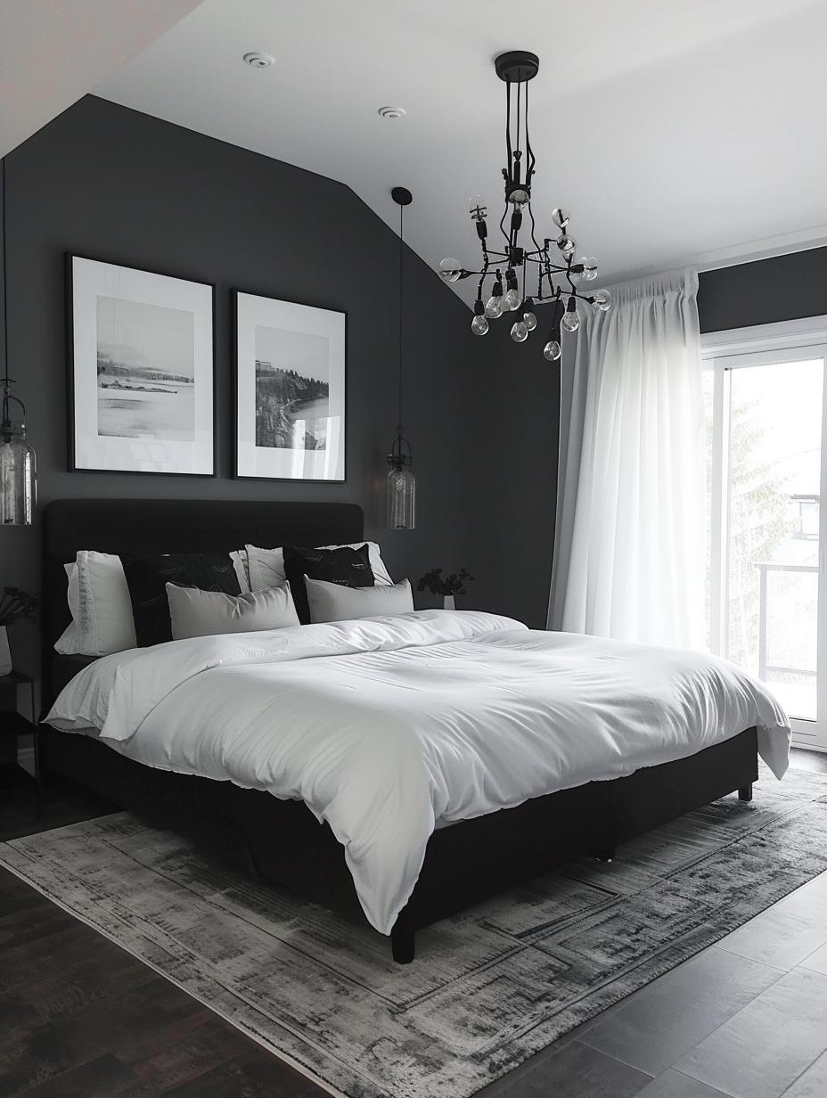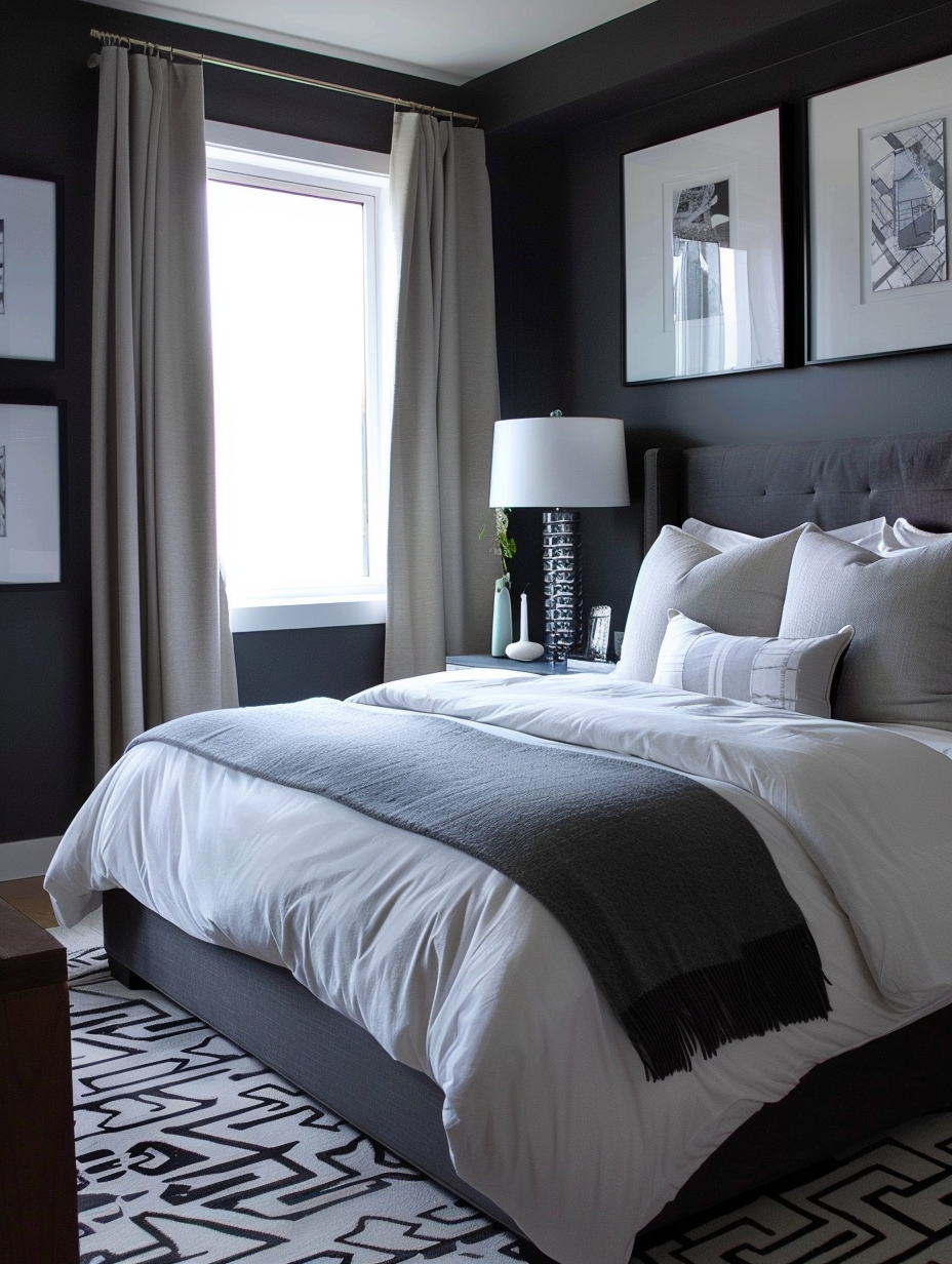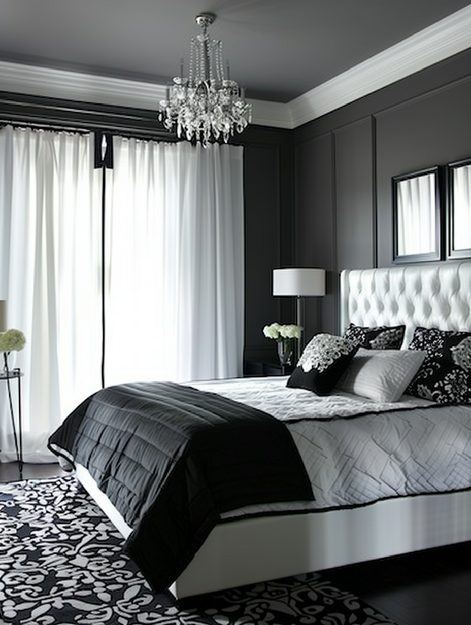 Merging of black and white shades in a gray bedroom establishes a classic appearance. Gray colors used on walls become a ground for black and white furniture and decor. The monochrome scheme conveys luxuriousness, besides, the play of lights and captions create dimension and disparity.