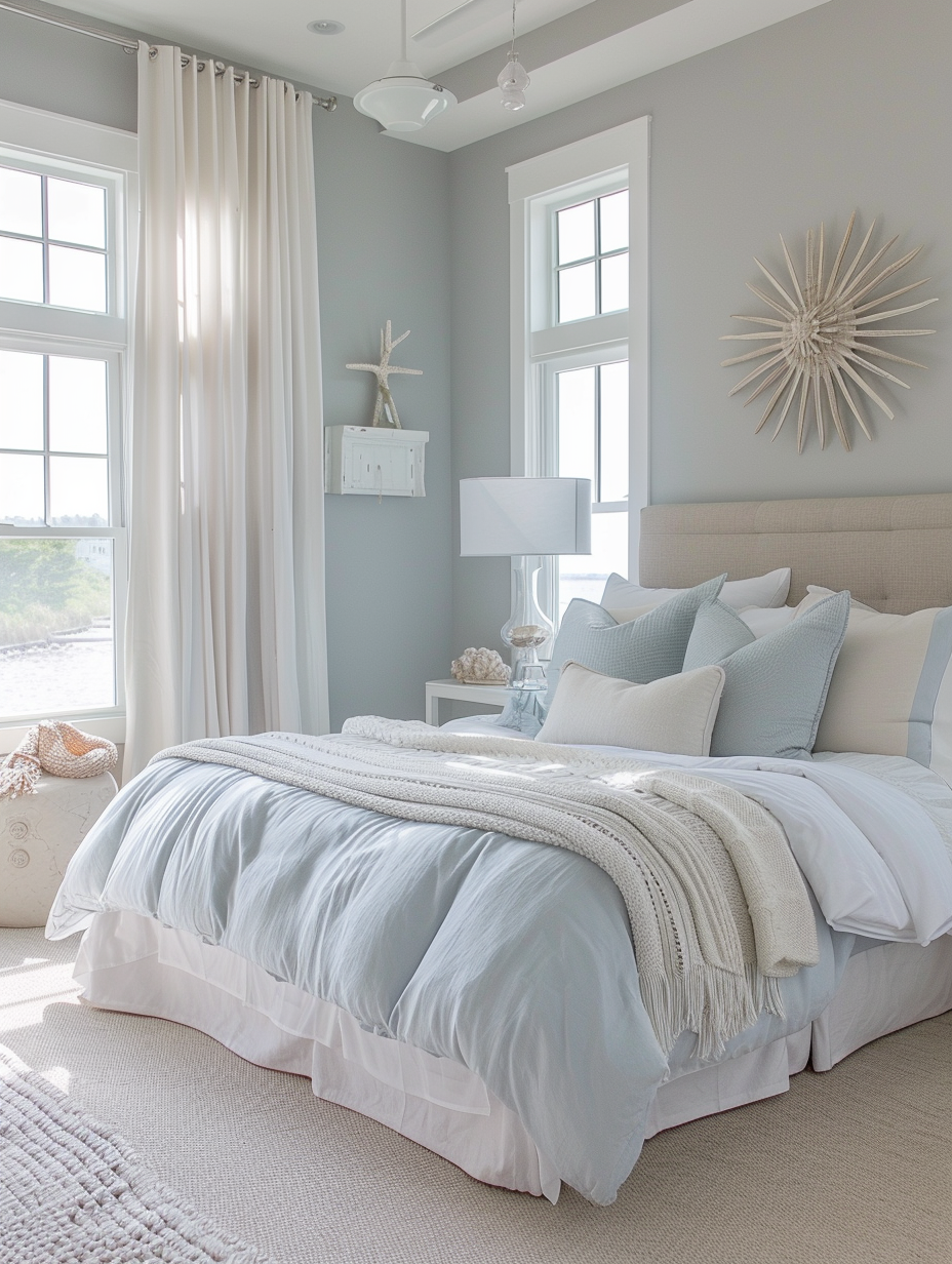 A quiet sea or sky is reflected in a coastal gray bedroom. The combination of soft gray walls with light blue accents sets a tone of relaxation, which is perfect for a good sleep. White furniture and sandy beige colors would help to compliment the coastal theme. The recommendation is to add such coastal elements as seashells and driftwood to the room.