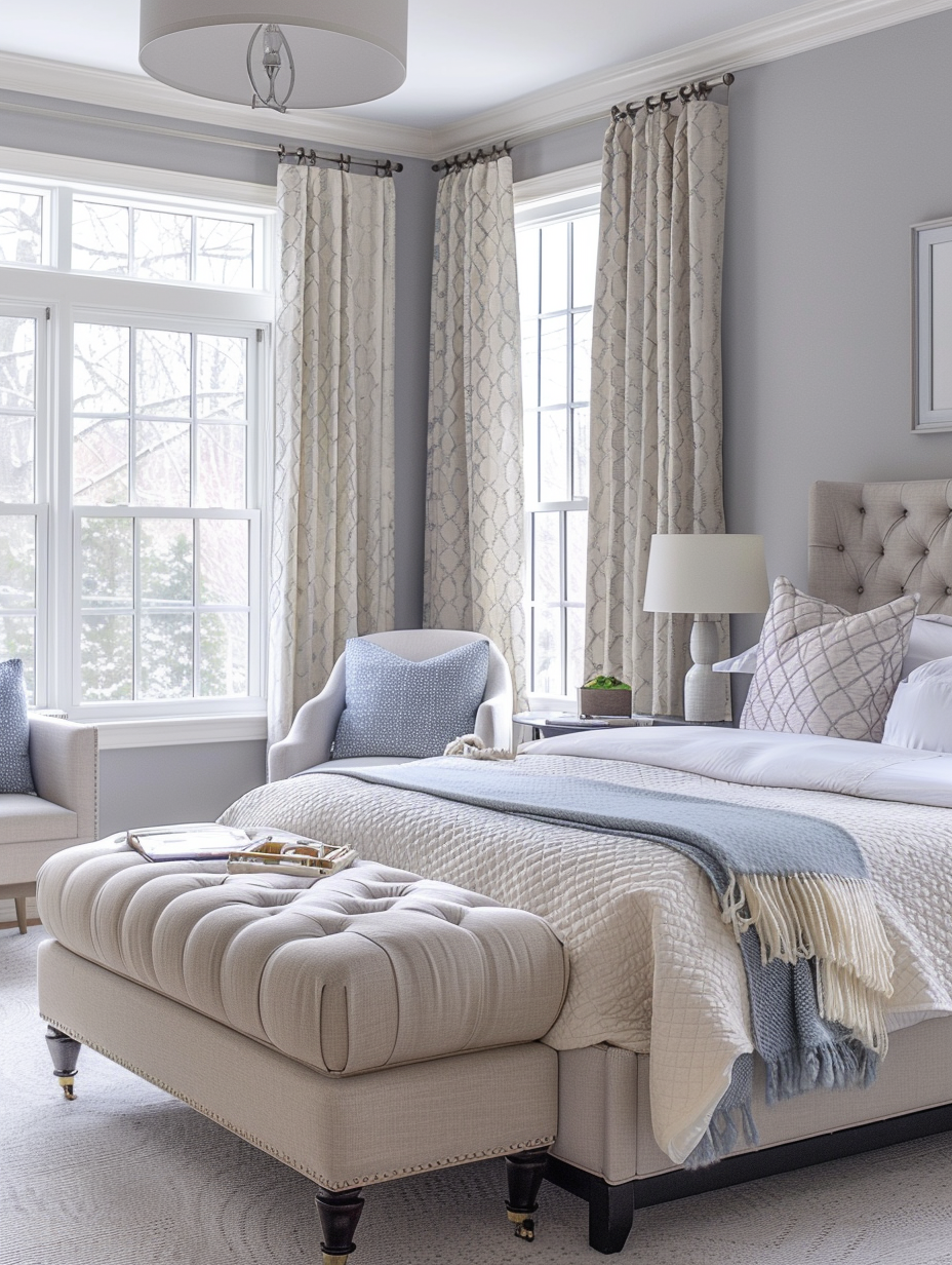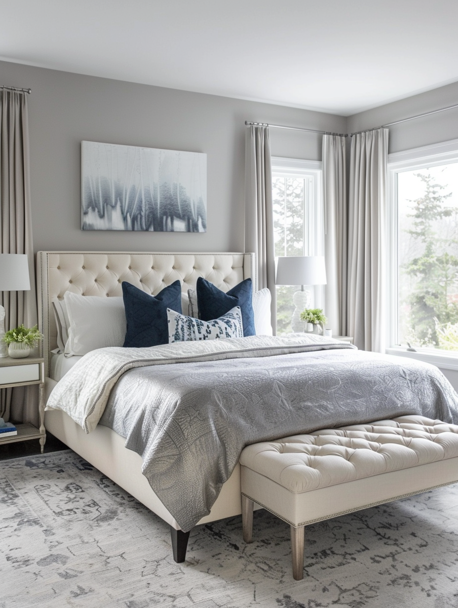 A transitional gray bedroom combines the modern and traditional styles impeccably. Gray walls that are coupled with cream and beige colors reveal a serene and elegant palette. Combine the traditional and the modern with a twist to give a fresh look. A pop of blue is the final touch of contrast.