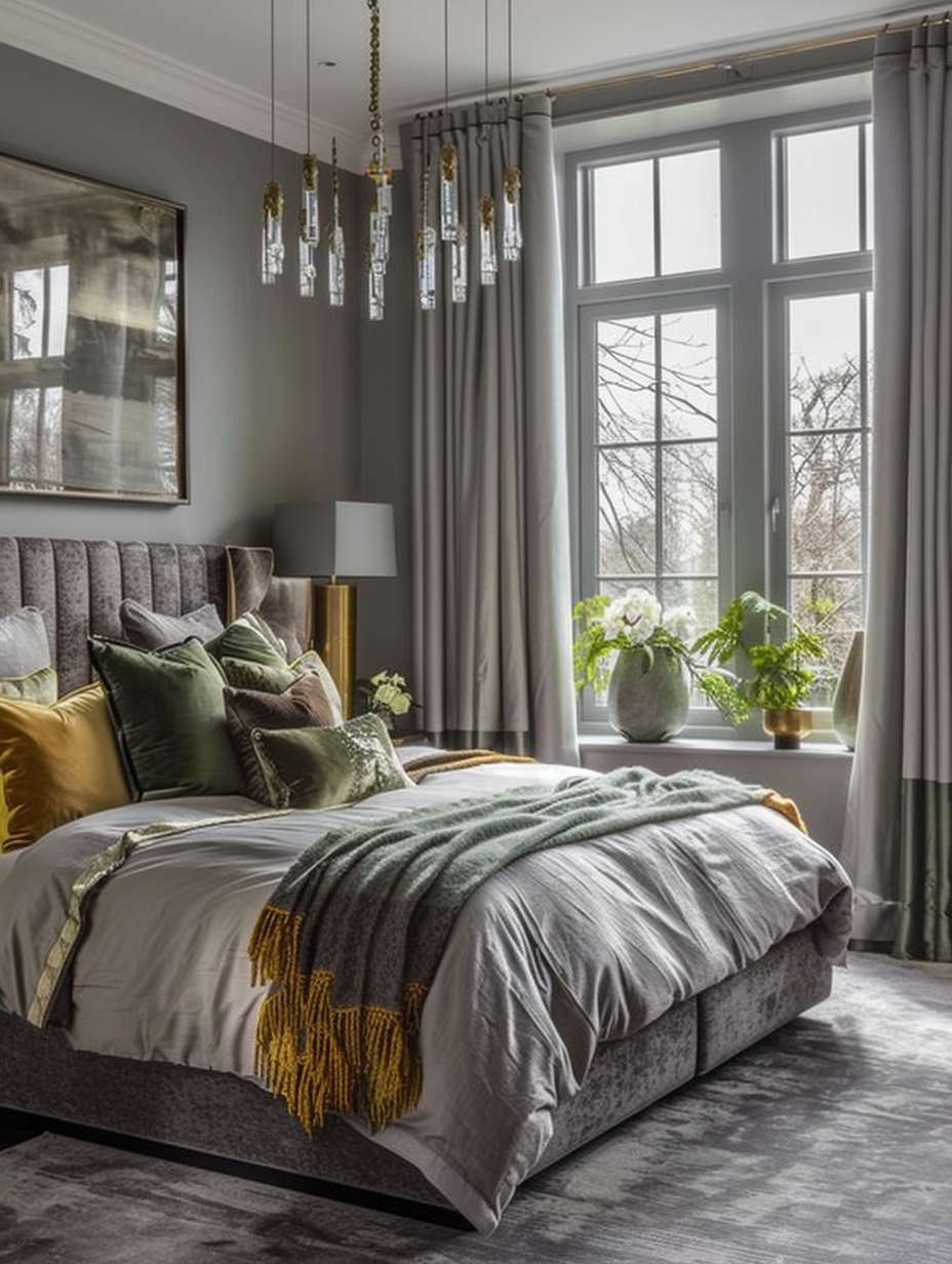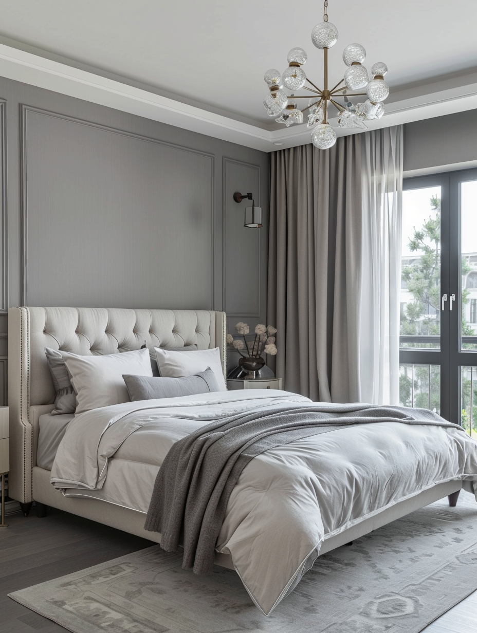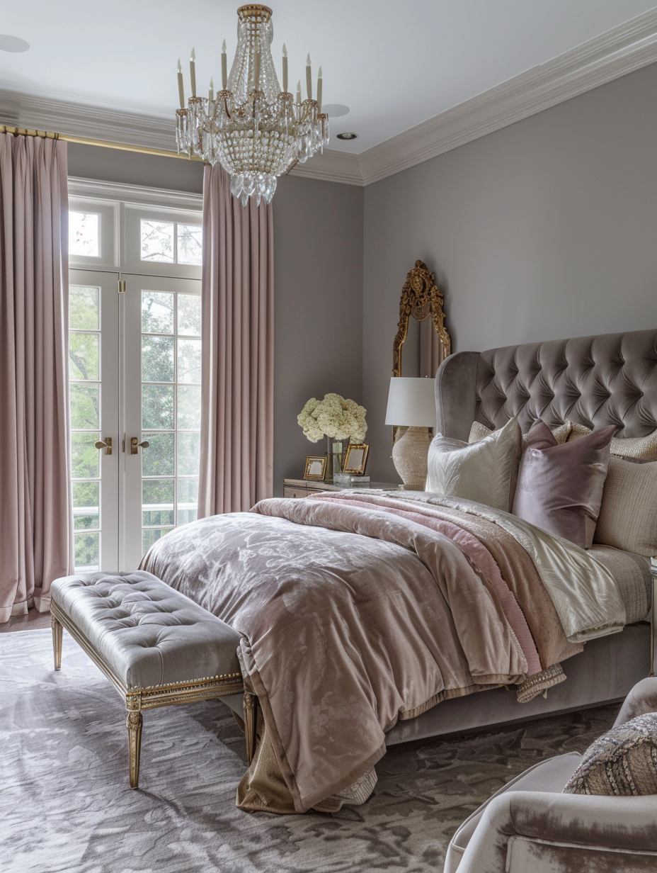 Integrating glamorous elements into a gray bedroom lifts it to an extravagant level. The gray walls are perfectly veiled by the combination of cream, pink, and gold tones. Using expensive fabrics such as velvet or silk in the furnishings and decor. The use of chandeliers and mirrored furnishings gives a touch of glow.