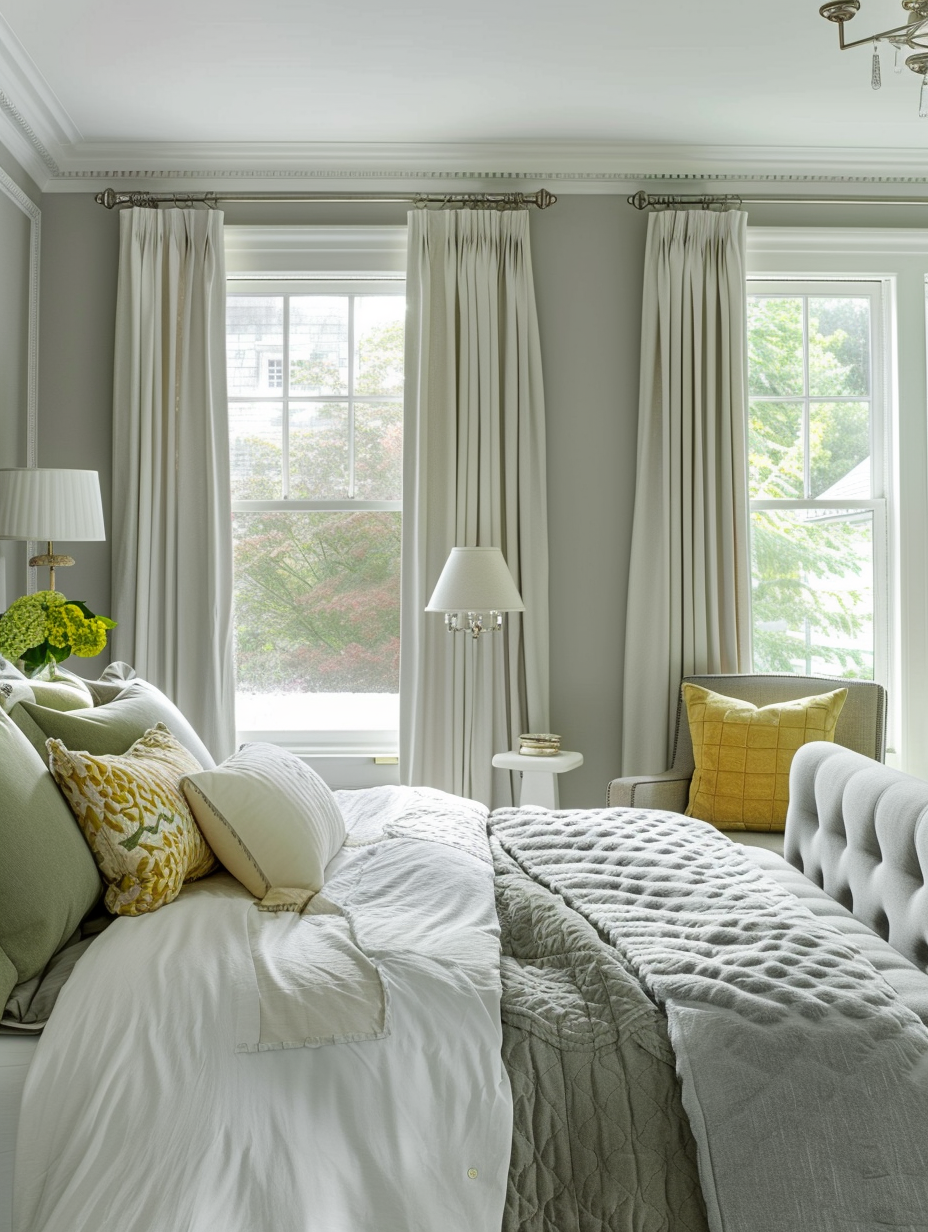 Adding different textures and finishes to your room is a perfect way to include more details and a distinct look. The gray walls are both dark and light gray shades in the furniture and accessories. To suit your unique style, layer green and yellow through delicate color pops. To mimic or even set the trend, incorporate shiny components of the decoration. Materials of various art, such as velvet, linen, and silk, being added to a room can cause a luxe feeling.
