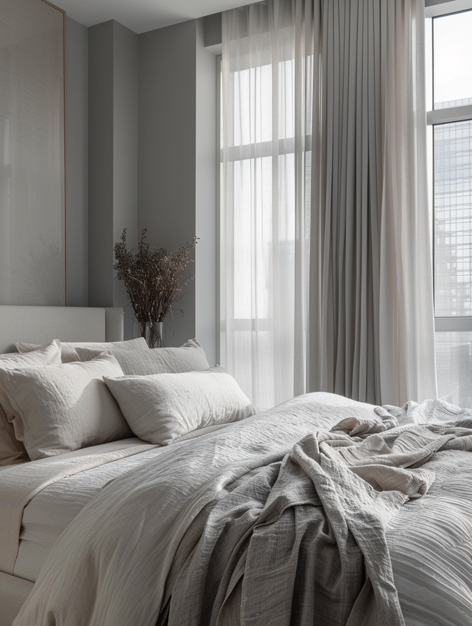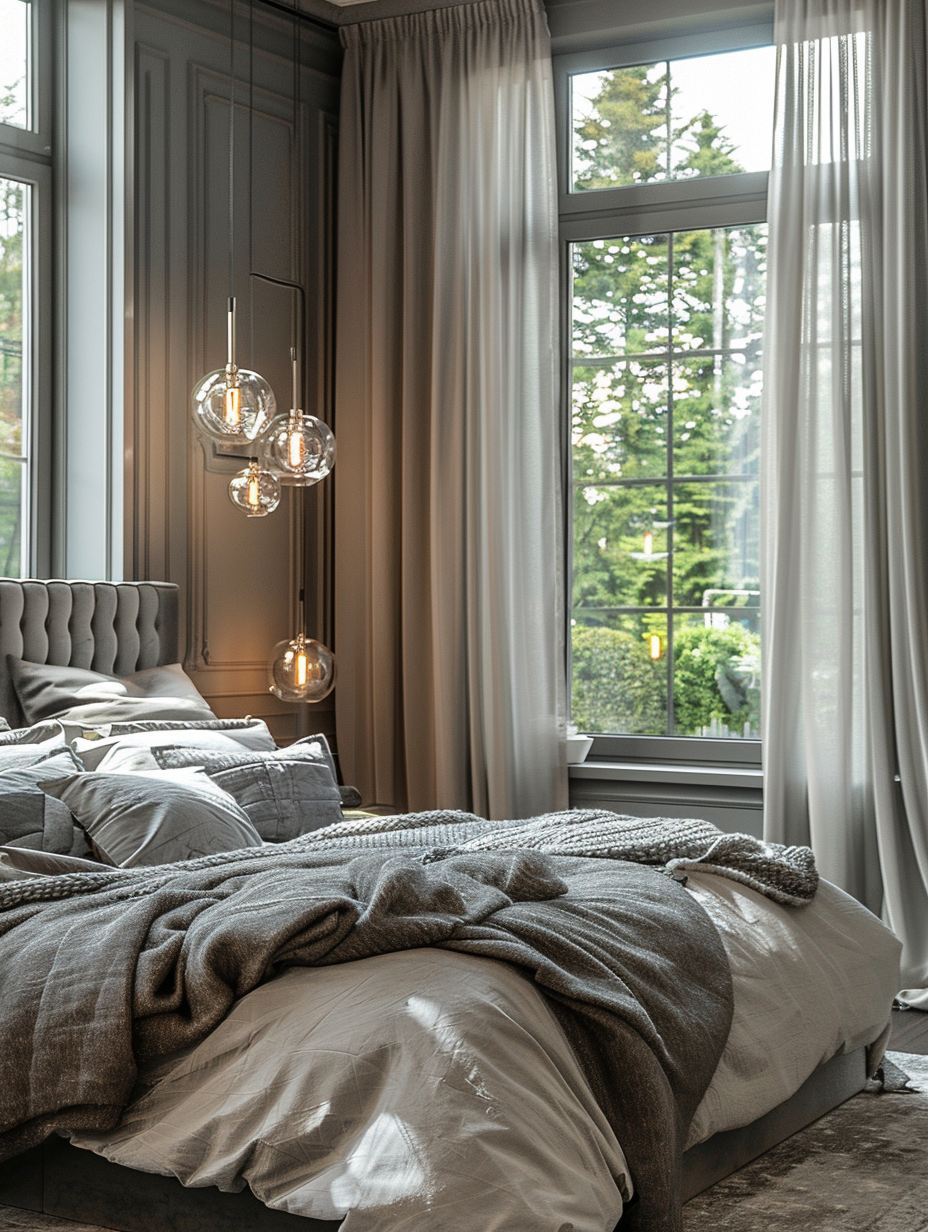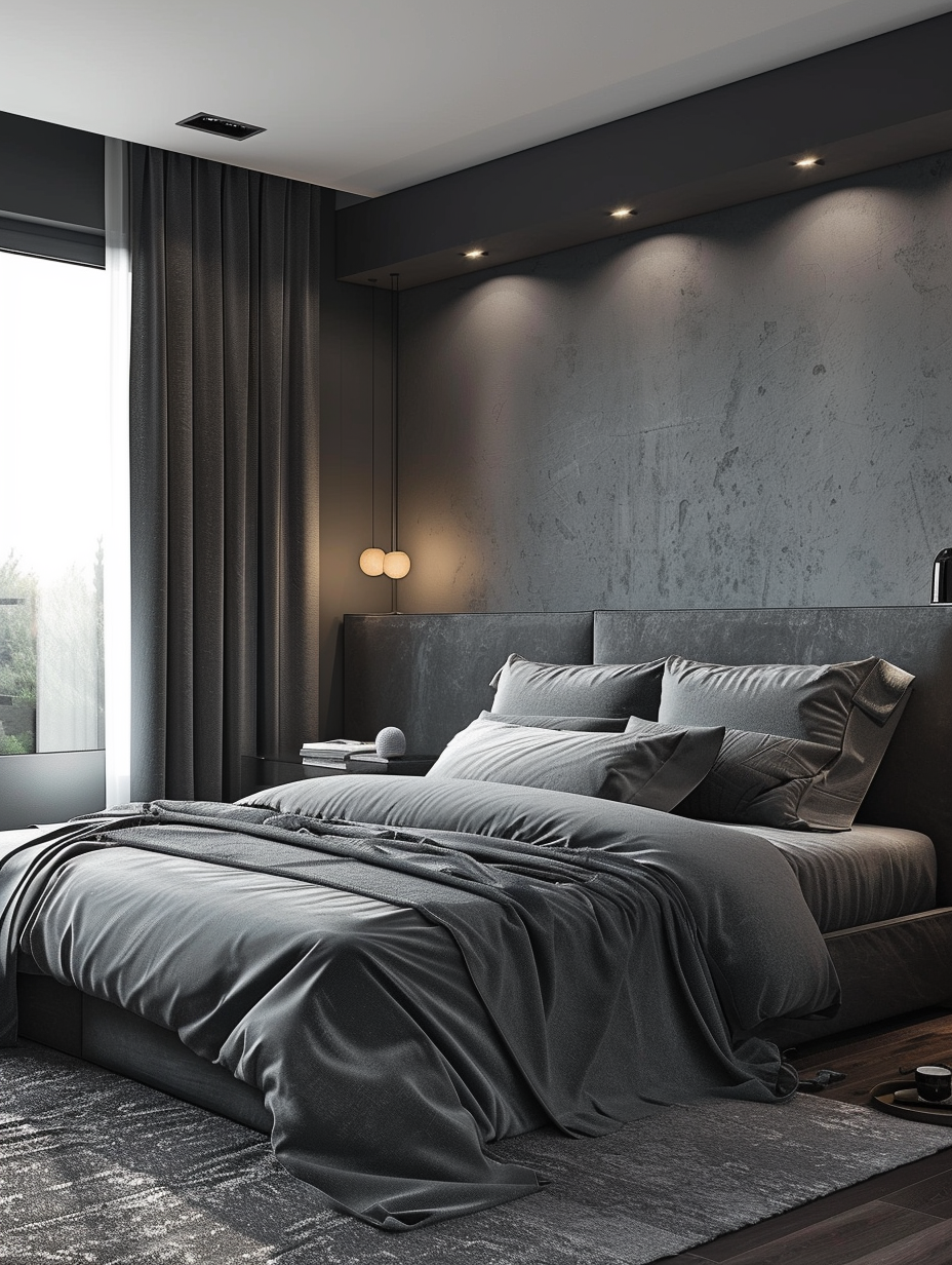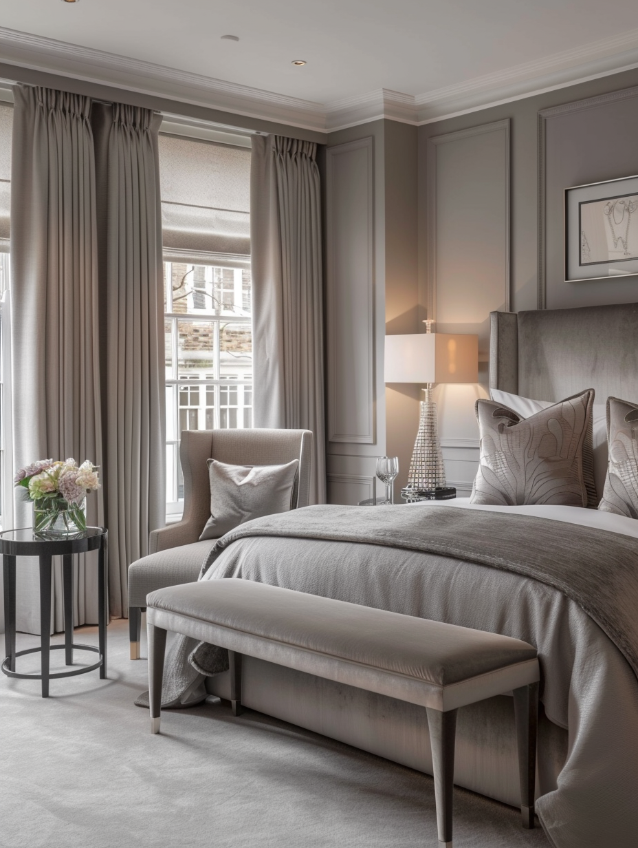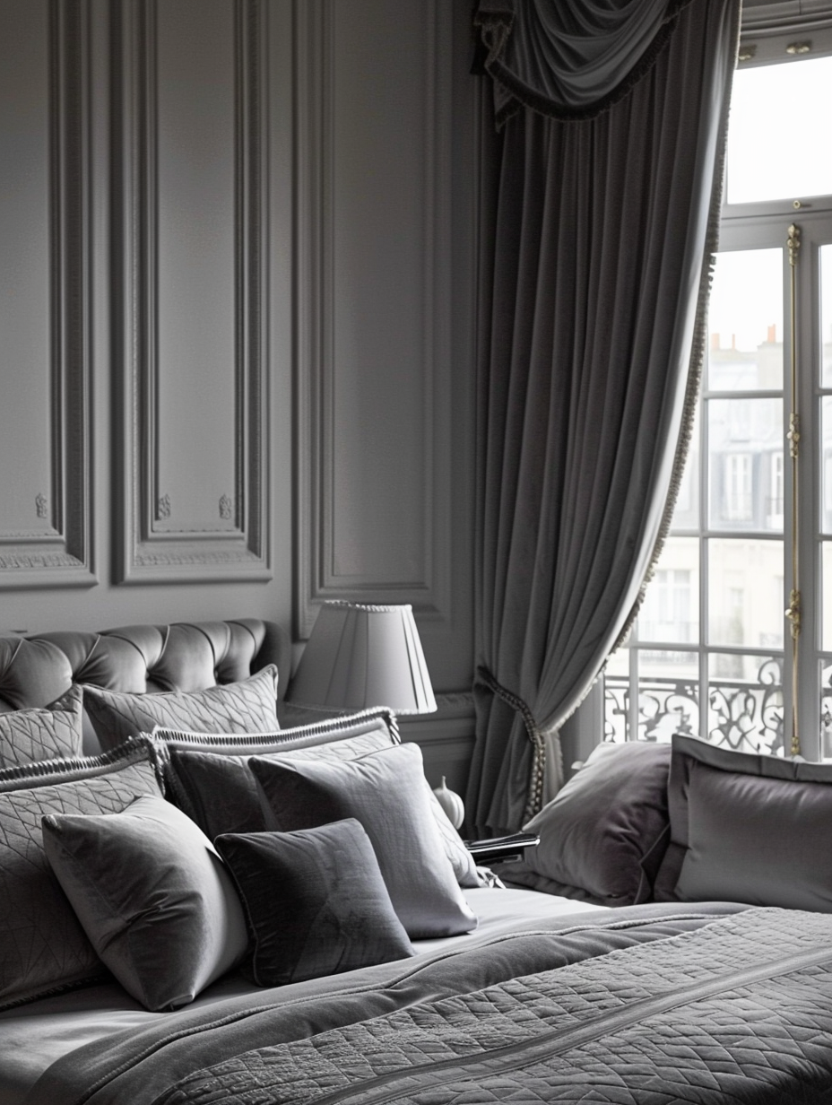 In a grey bedroom the luxurious fabrics make the room elegant and comfortable. Grey walls and the utilization of luxury materials such as velvet, silk, and satin, create an indulgence ambiance. Utilize luxuriously soft pillows, elegant drapes, and tasteful linen to enhance the luxurious feel of the space.