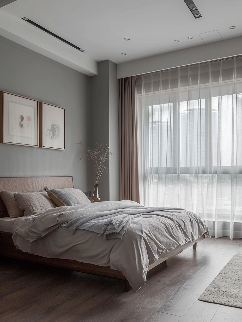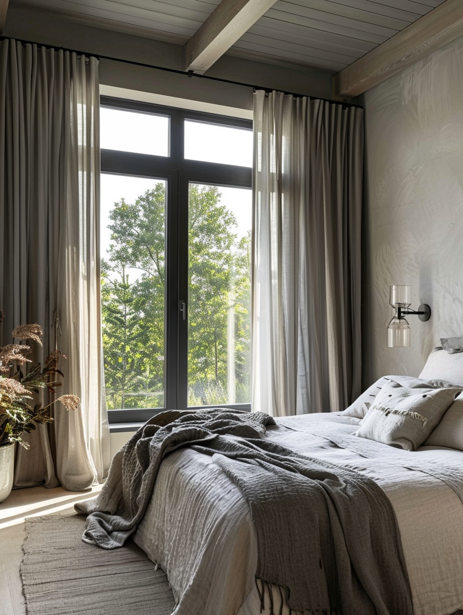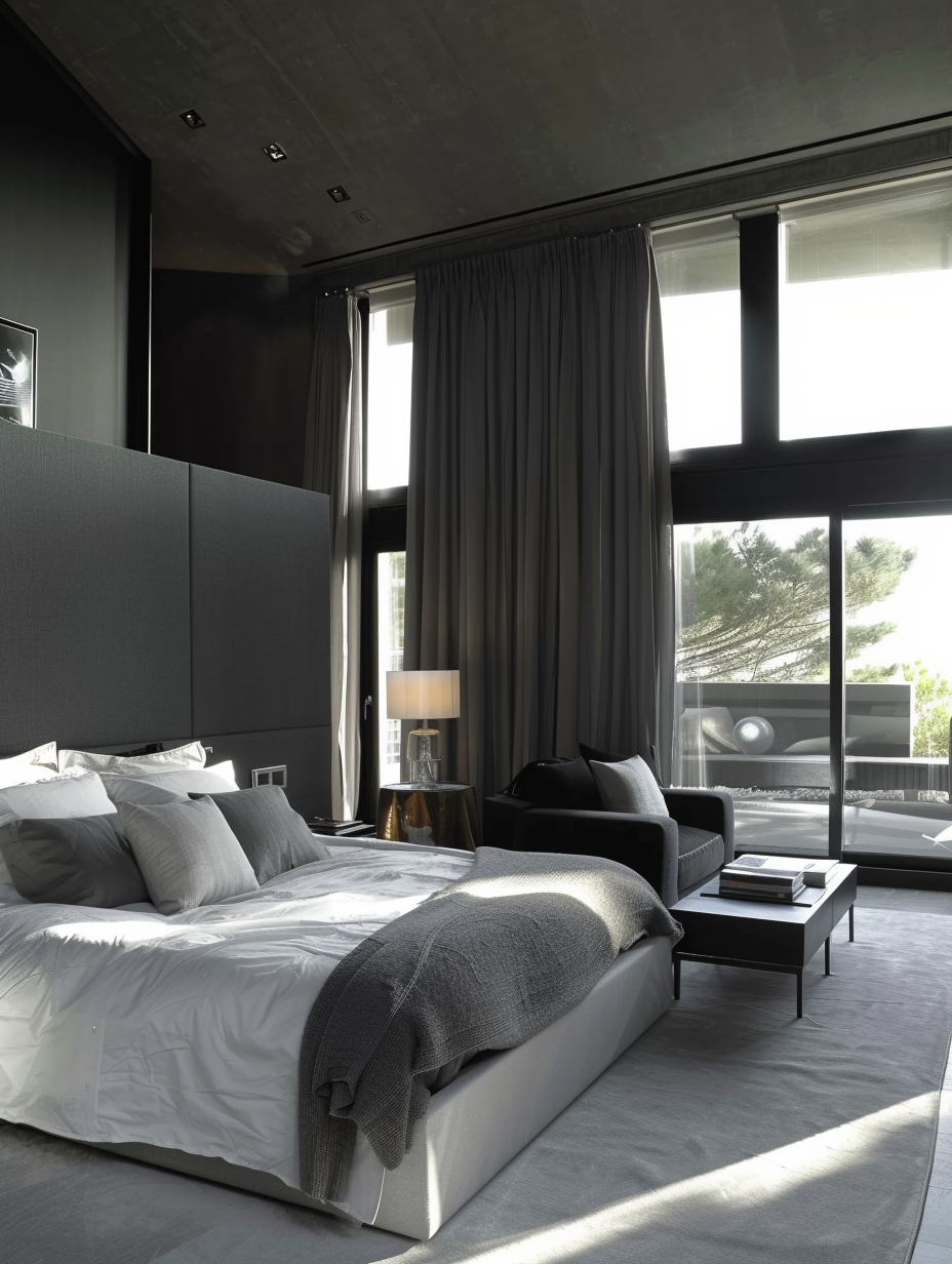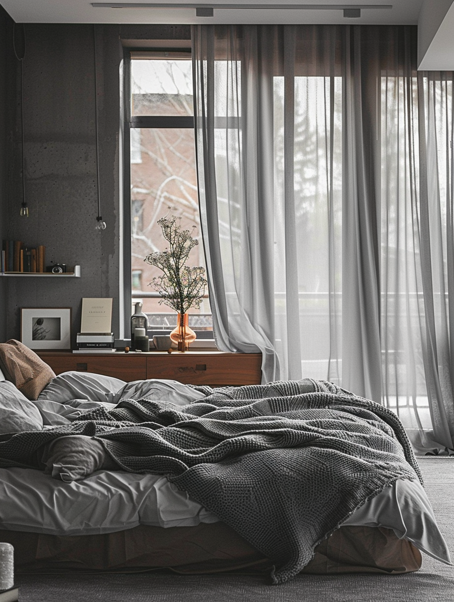 In a grey bedroom the luxurious fabrics make the room elegant and comfortable. Grey walls and the utilization of luxury materials such as velvet, silk, and satin, create an indulgence ambiance. Utilize luxuriously soft pillows, elegant drapes, and tasteful linen to enhance the luxurious feel of the space.