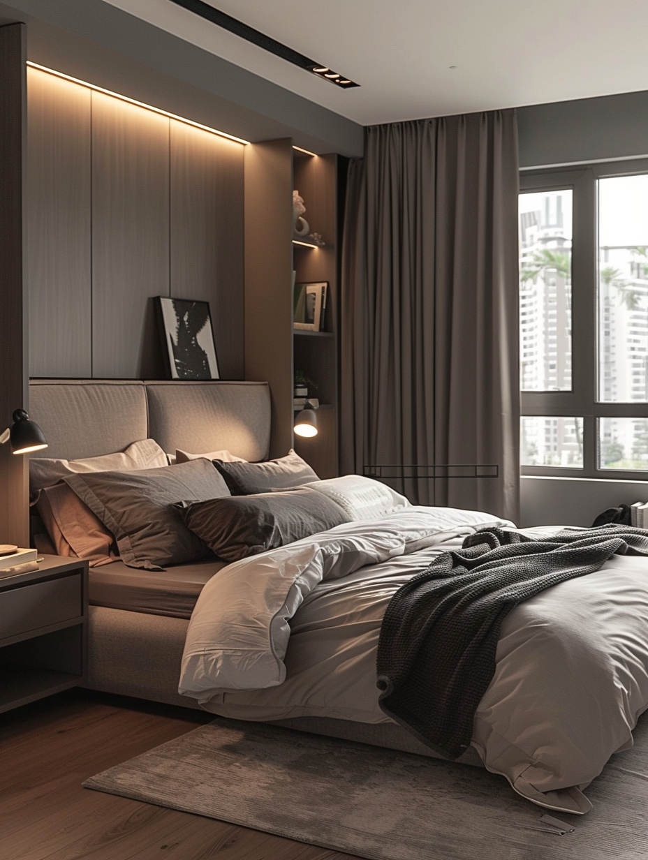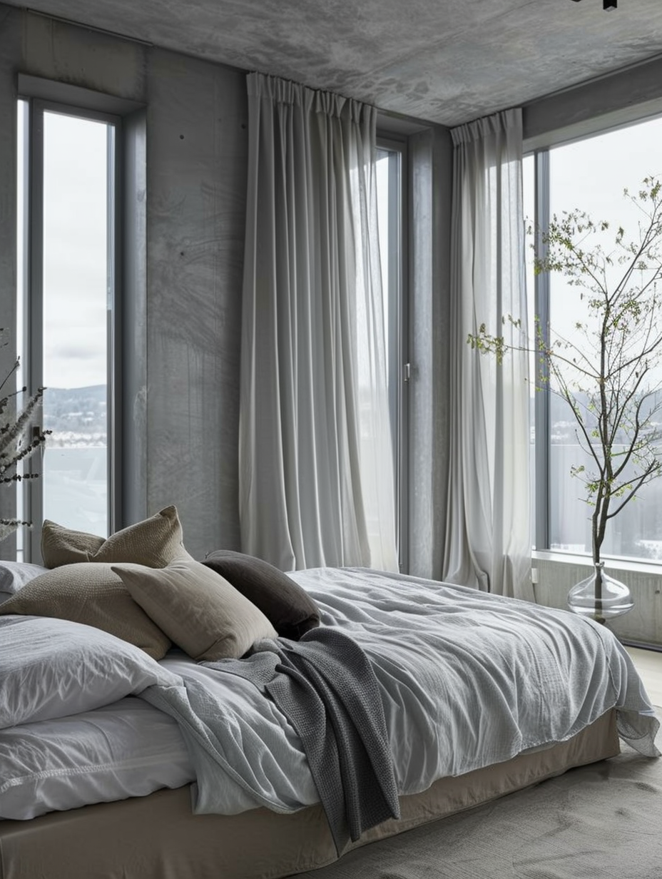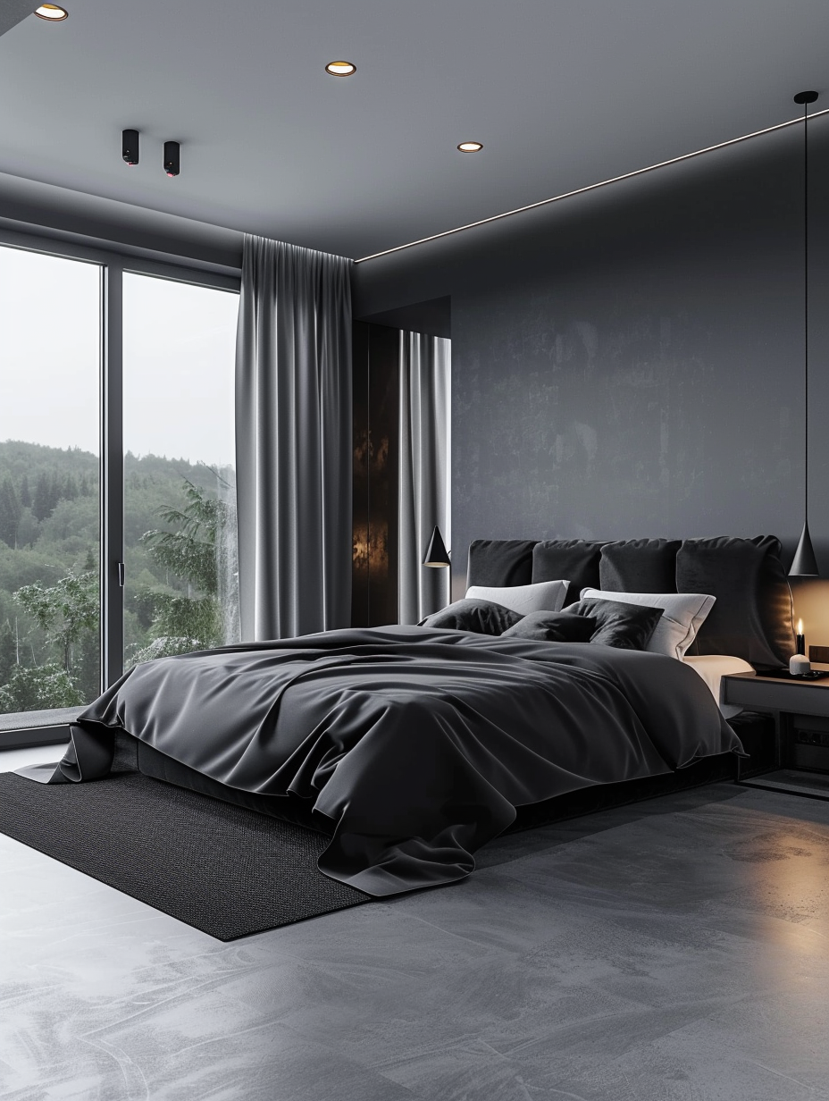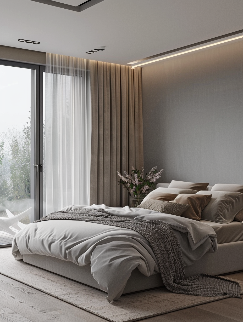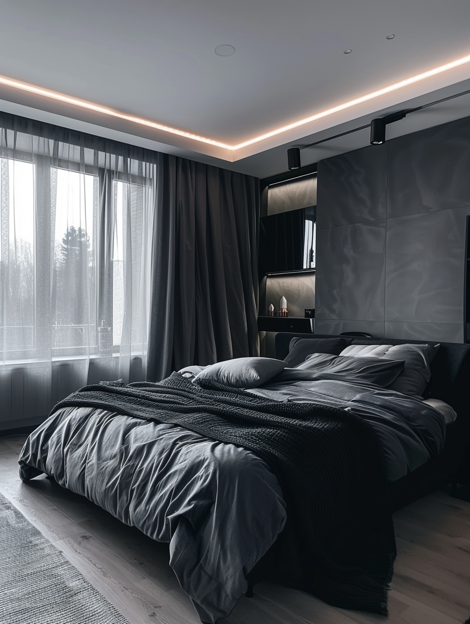 In a grey bedroom the luxurious fabrics make the room elegant and comfortable. Grey walls and the utilization of luxury materials such as velvet, silk, and satin, create an indulgence ambiance. Utilize luxuriously soft pillows, elegant drapes, and tasteful linen to enhance the luxurious feel of the space.
