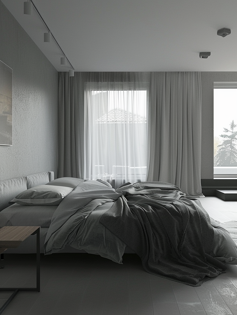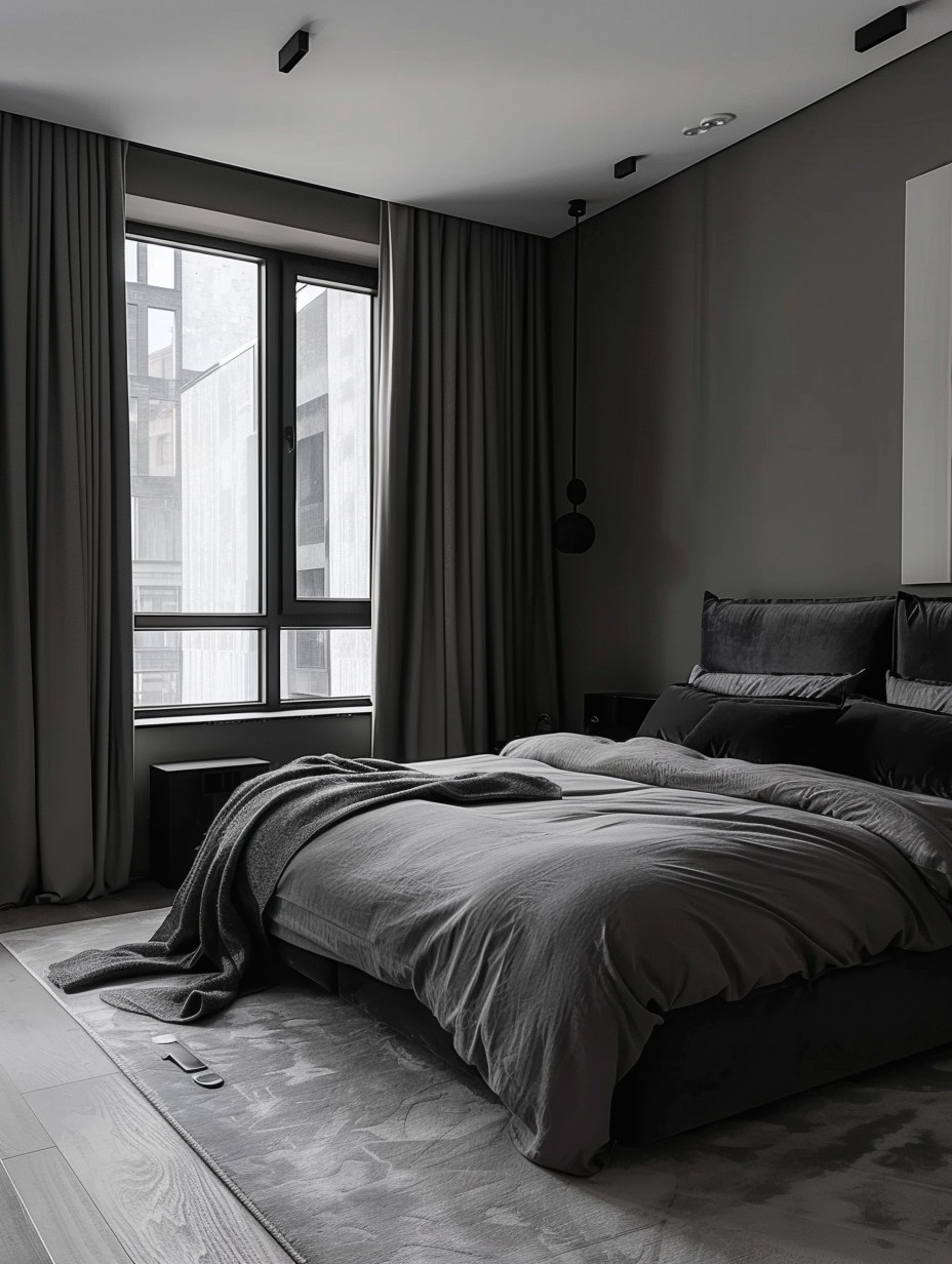 Harmony is procured in a monochromatic grey bedroom through the use of different hues of grey. Light and dark gray furnishings are combined with grey walls to reach a sleek appearance. The use of various textures like matte, glossy, and metallic finishes introduces visual depth to the interior. Brevity of decoration and symmetry of design help to create a calm and harmonious atmosphere.