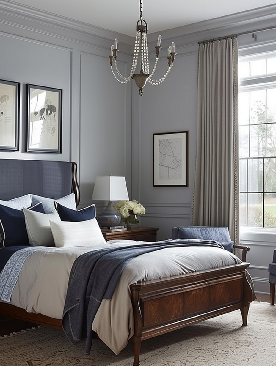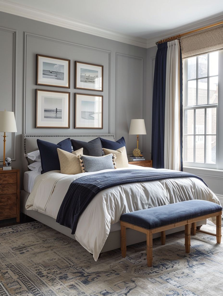 A gray bedroom presents traditional classic charm that remains timelessly stylish. Go for grey walls combined with both light and brown tables that are set to order. Accent the area by introducing navy blue and cream and recovering two walls. Select exclusive furniture plans and fancy material to set up the area look.