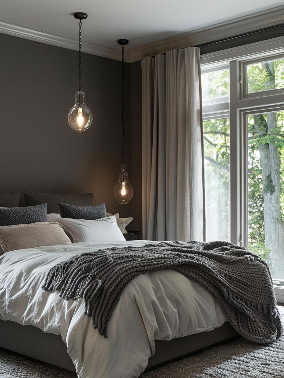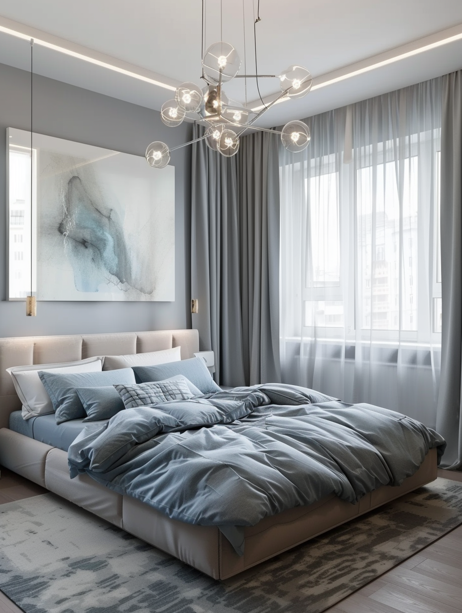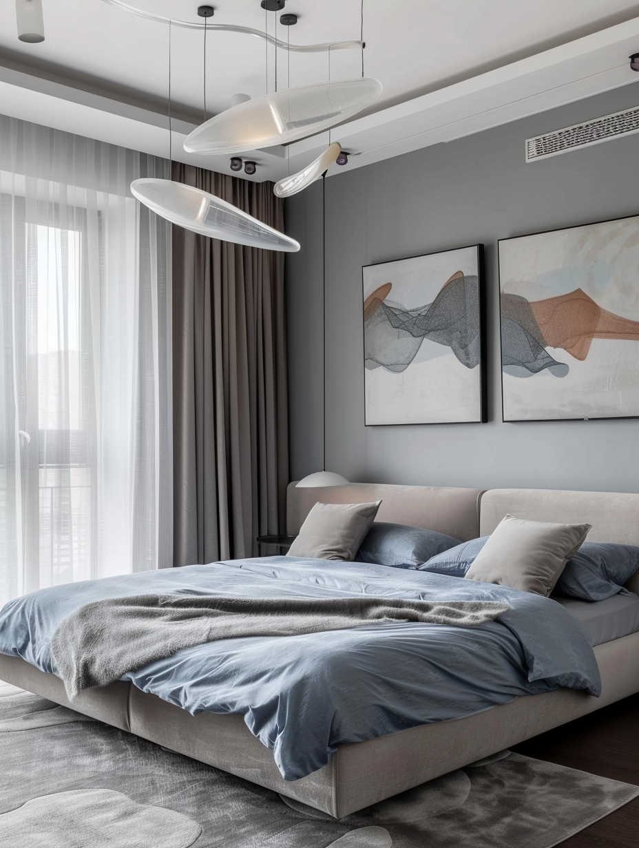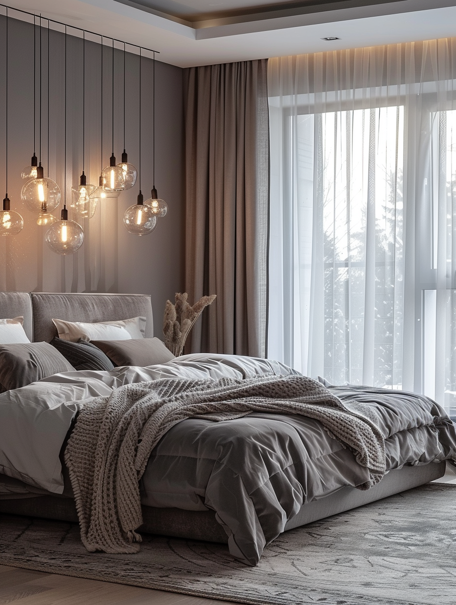 Creative and dynamic lighting can turn a gray bedroom into an attractive space. The walls provide a great background for the uniqueness of the fixtures that add personality and style. Of the three, instead of or, LOL is funny, over dimmable lights, you can easily change the atmosphere, improving the use of the space and the quality of the ambience.