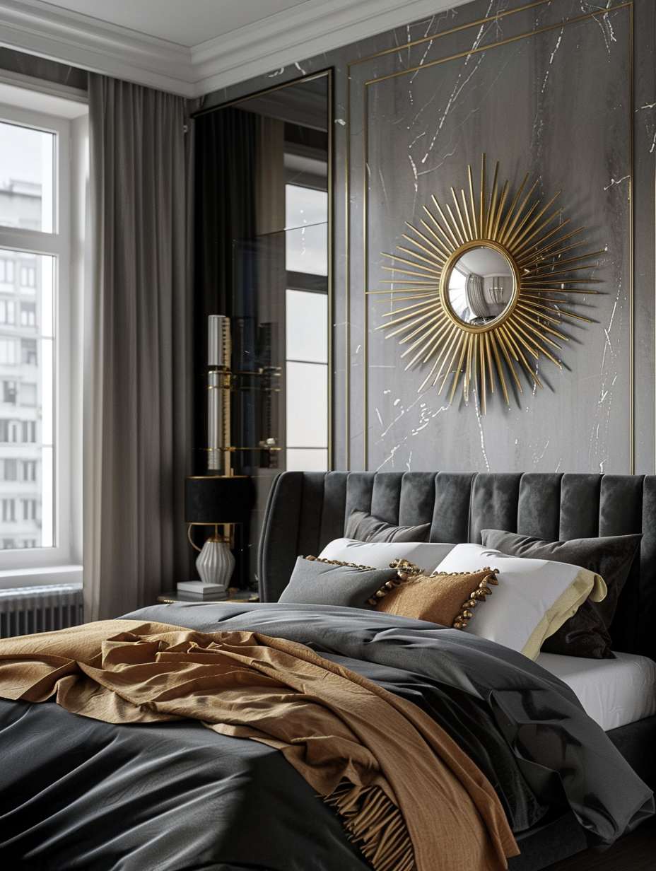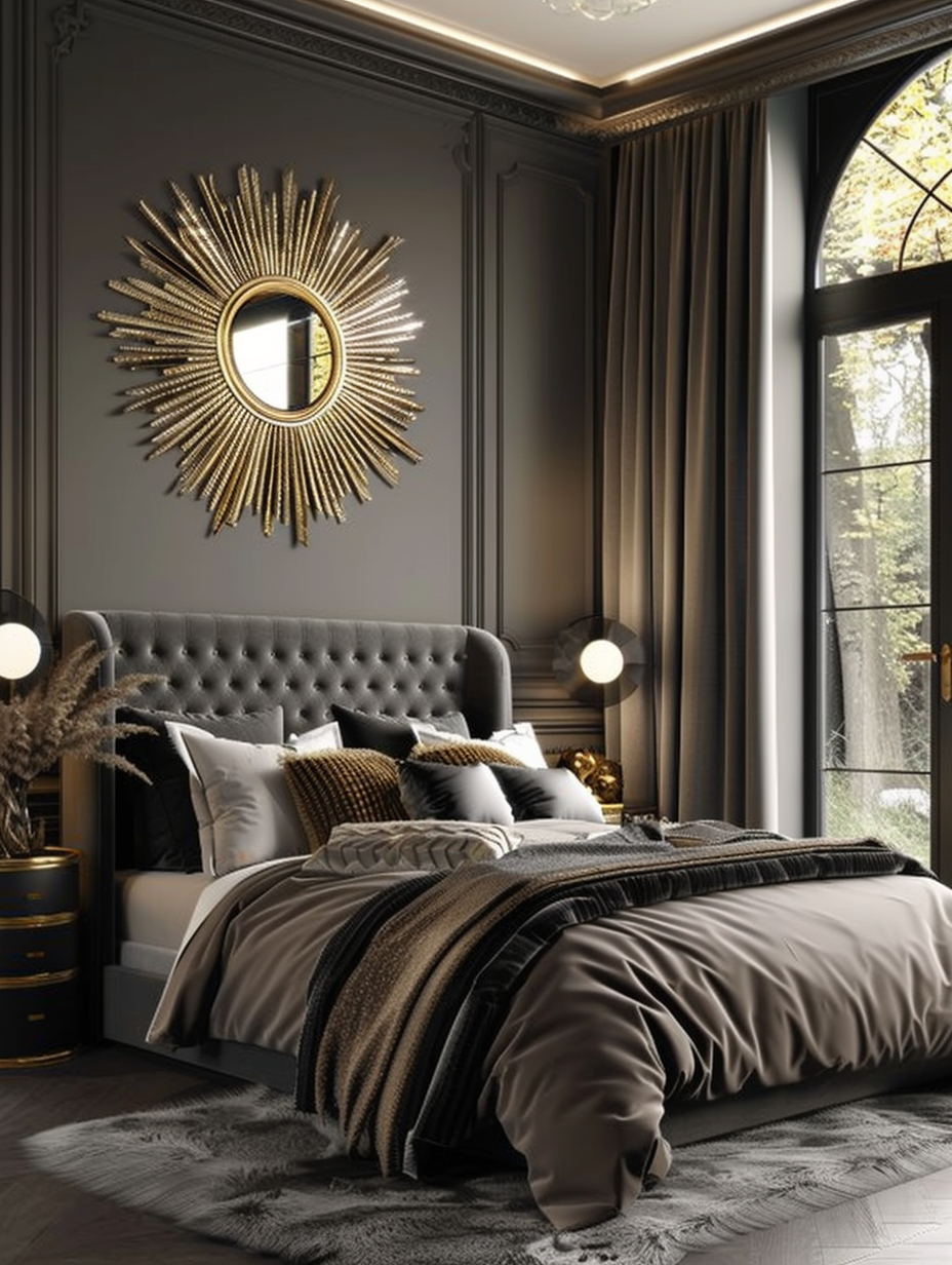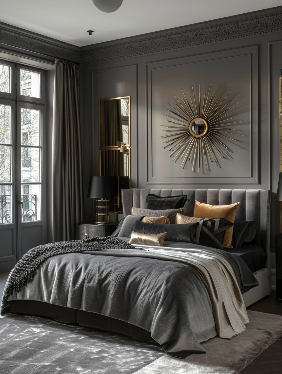 Opulence and bold design are the centre of an Art Deco gray bedroom. Combining gray walls with black and gold hues results in a strong impact. Design furniture and complement them with statement accessories that are on-trend, such as marble and brass. Standout pieces like a sunburst mirror or an upholstered headboard make the Art Deco style popular more!